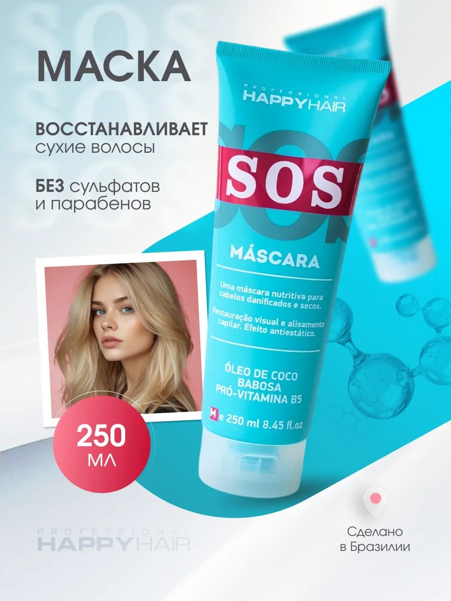 Профессиональная маска суфле Happy Hair SOS. Бессульфатная маска Первая после процедурная с эффектом ботокса. Высокое содержание пантенола и биотина в составе оптимизирует метаболические процессы в клетках кожи, стимулируя рост волос. Без сульфатов и парабенов. Витамин А (ретинол) или витамин молодости, оказывают укрепляющее свойство и обеспечивает волосы здоровым блеском. Мягкие овсяные аминокислоты (oat amino acids) удерживают влагу и дисциплинируют волосы. Идеальна для сухих и нормальных волос. Для лучшего эффекта необходимо использовать весь комплект.