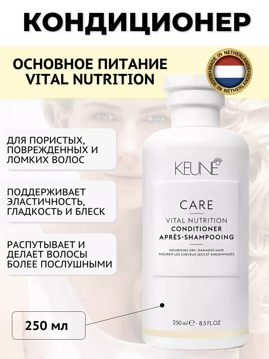 Смываемый кондиционер Vital Nutrition Conditioner Keune восстанавливает баланс влаги в сухих, пористых и поврежденных волосах. Он добавляет новую энергию тусклым и безжизненным волосам, без утяжеления. Кондиционер насыщает волосы живительной влагой, жирными кислотами и витаминами, защищает от грозящих опасностей и возвращает прядям природную красоту.