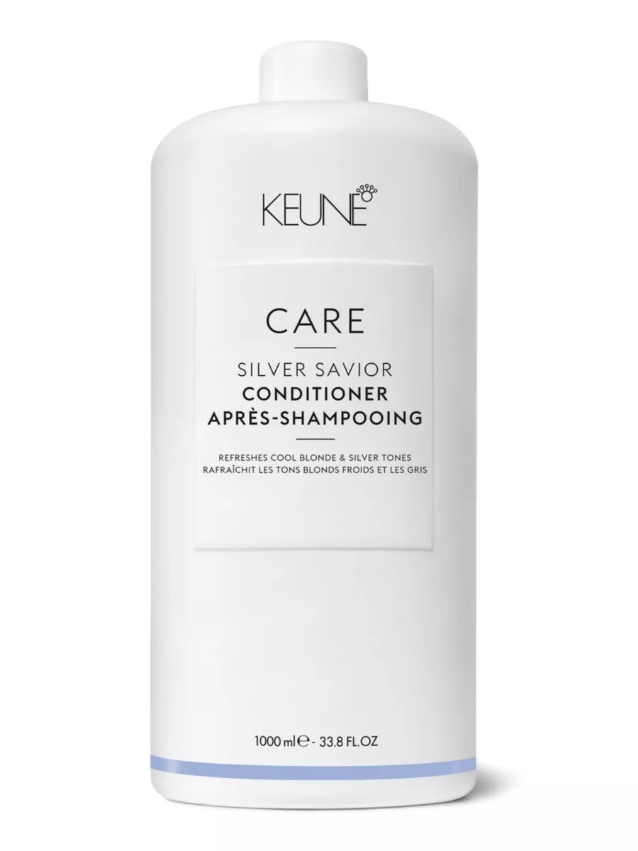 Keune Care Silver Savior Conditioner contains violet pigments to remove unwanted yellowness and add a cool shade to bleached hair.