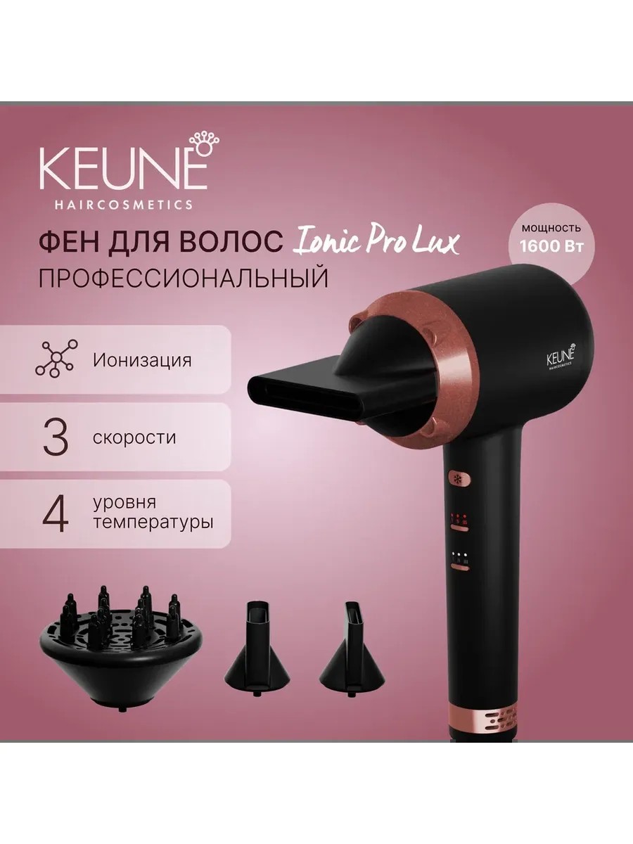 Фен Ionic Pro Lux HD-1803Di черный от KEUNE — это стильный и мощный помощник для создания идеальной прически. Его элегантный черный дизайн с медными акцентами станет украшением любой ванной комнаты.