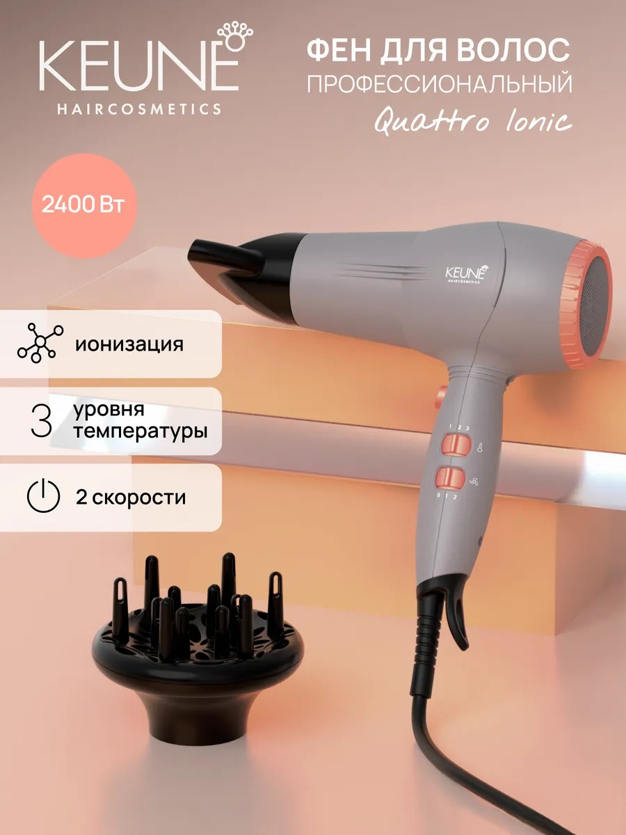 Фен KEUNE Quattro — это профессиональный инструмент, который поможет вам создать идеальную прическу в домашних условиях. Модель оснащена ионизацией, которая делает волосы более гладкими и блестящими, а также режимом холодного воздуха для фиксации укладки. В комплекте с феном идут две насадки: концентратор для направленного потока воздуха и диффузор для создания объема. Три режима работы и две скорости позволяют подобрать оптимальные настройки для любого типа волос.