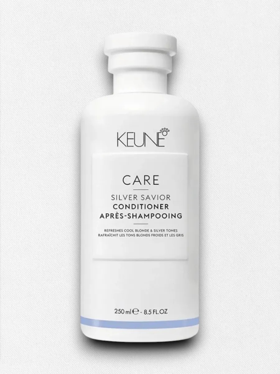 Keune Care Silver Savior Conditioner contains violet pigments to remove unwanted yellow tones and add a cool shade to bleached hair.