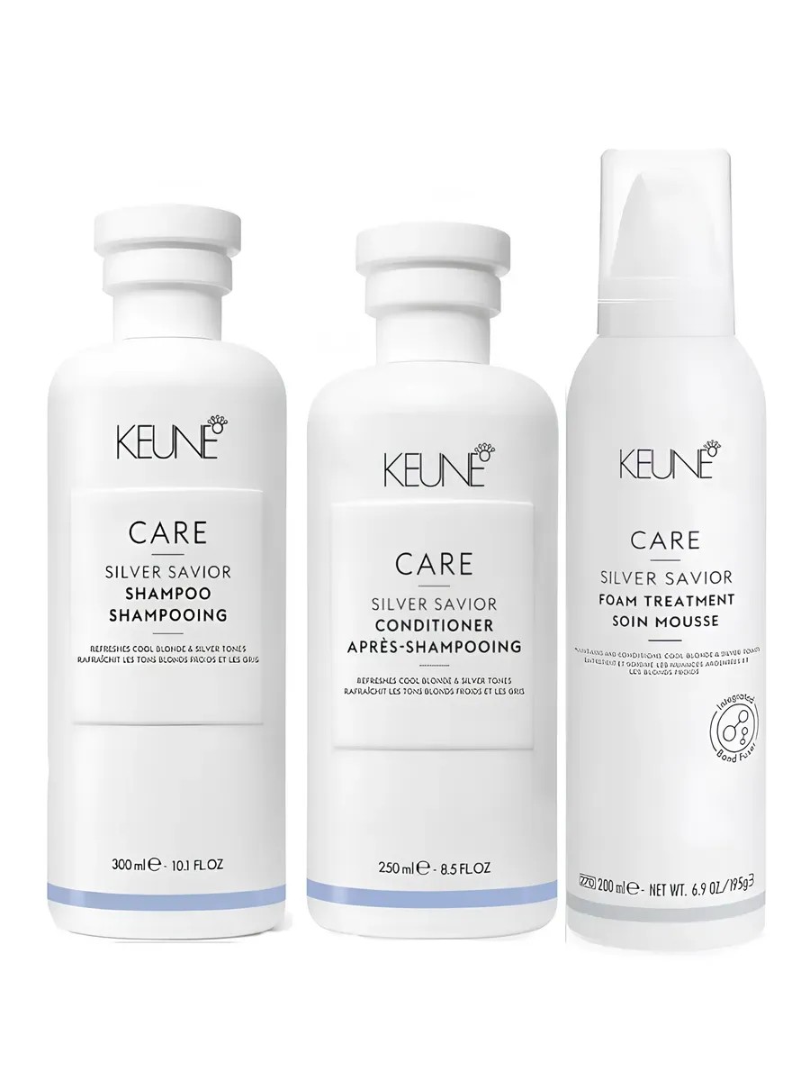 Представляем Вам главного помощника по профессиональному уходу за волосами - Набор для осветленных волос и нейтрализации желтизны волос от Нидерландского бренда KEUNE – Silver Savior Care. Набор состоит из шампуня, кондиионера и пенки-ухода - настоящей основы для ухода за волосами.