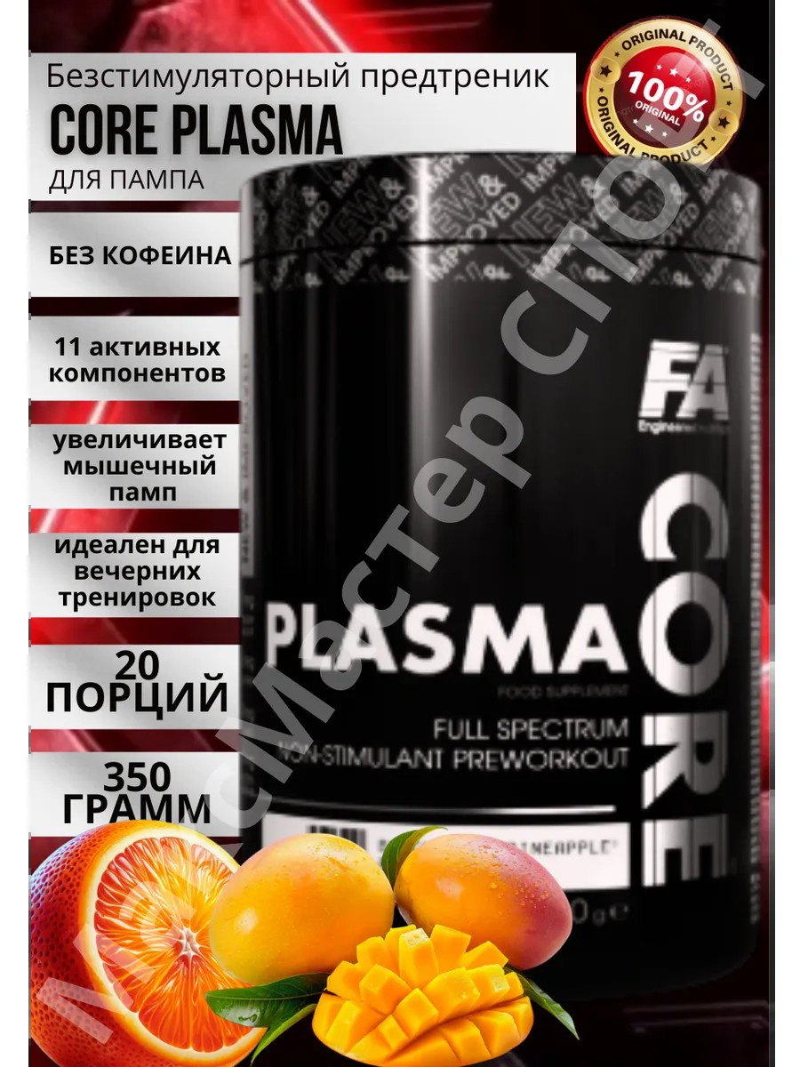 Предтренировочный комплекс для мужчин и женщин Кор Плазма (Core Plasma от Fitness Authority) — это безстимуляторный предтренировочный комплекс, направленный на улучшение выносливости, концентрации и мышечного пампа. Формула включает 11 активных компонентов, среди которых цитруллин малат, бета-аланин, AAKG и глицерол монстеарат. Эти ингредиенты способствуют расширению сосудов, улучшению кровотока и насыщению мышц. Холин и тирозин помогают поддерживать когнитивные функции во время тренировки, а витамины группы B способствуют нормальному обмену веществ. Продукт не содержит кофеина, благодаря чему подходит для вечернего приёма. Идеально подойдёт как новичкам, так и продвинутым спортсменам, особенно тем, кто чувствителен к стимуляторам.