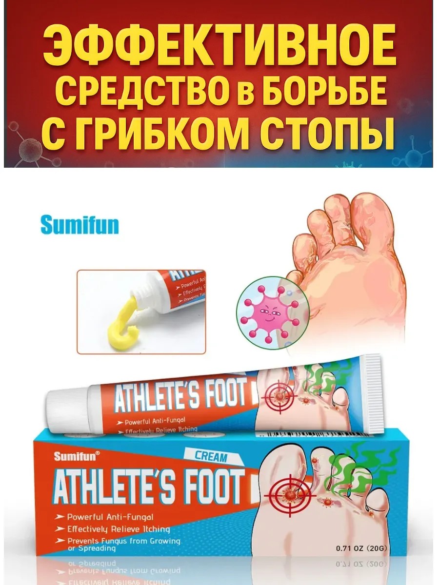 This product has a comprehensive effect: it alleviates foot fungus, helps restore nails, eliminates dryness and cracks between the toes, combats subungual warts, and is also suitable for treating foot rash.