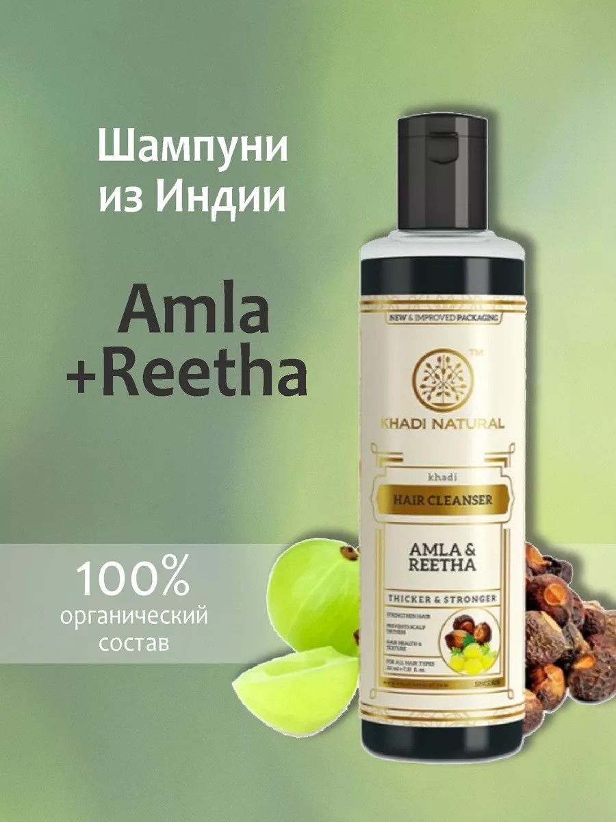 Шампунь Кхади Амла и Ритха - аюрведический шампунь, в составе содержит растительные экстракты растений "золотого ряда ", способствует восстановлению волос, их питанию и укреплению. Cпециально разработанный состав с использованием полезных веществ Reetha и Amla, которые известны своими бесчисленными преимуществами с точки зрения ухода за кожей головы и волосами. Использование этого мягкого и нежного травяного очищающего средства для волос помогает ограничить выпадение волос, придает волосам силу и объем, предотвращает преждевременное поседение волос, способствует эффективному росту волос, а также решает проблему перхоти. Амла известна своими вяжущими, антибактериальными, антиоксидантными свойствами и, являясь естественным источником жирных кислот, витамина С, железа и кальция, помогает бороться с раздражениями и инфекциями кожи головы. Подобранный состав трав не сушит волосы, оказывает лечебное действие. Производитель Кхади не использует химические компоненты для вспенивания продукта. В составе содержатся индийские мыльные орехи (Ритха), которые нежно очищают кожу головы, не пересушивая и не раздражая.
