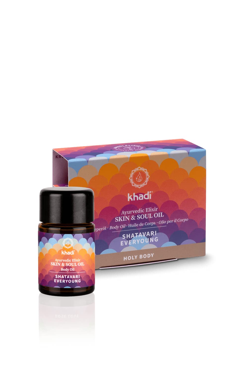 Shatavari Everyoung Body oil acts as a holistic rejuvenation oil - it is tightened, revitalized and ensures healthy skin elasticity.The Ayurvedic main active ingredients of this special recipe are Shatavari, Ashvaganda and Brahmi.They work with dry, mature skin, wrinkles and even with a pigmented lightweight.At the same time, the fine essential oils stimulate your mind and make applying a truly sensual experience.Feel how your soul is rejuvenated and reflected on your skin.The secret of the rejuvenating effect lies in the Khadi Shatavari Everyoung Elixier: According to old -fashioned Ayurvedic recipes, handpicked Indian medicinal herbs are gently boiled down through open fire in a traditional process.In the Ayurvedic plant extract (a medical decoction) produced in this way, the full potential and the individual effectiveness of the individual plants combine to form a harmonious whole.Louse your skin when she sings for you!Enjoy the revitalizing effect when the Shatavari Everyoung Elixir body oil pearls over your skin and envelops you into its sensual fragrance.You can already feel like your cells start while massaging, how to defend your cells - and wake up your senses.Discover the sonorous Shatavari Everyoung application ritual here, which reinforces the effects of Shatavari Everyo.Let us accompany you and feel rejuvenated from the inside out! Instructions Take 1-2 pum phones of the oil in your hand and massage it into your freshly showered and still slightly moist skin in a circular movements.Let the oil work and enjoy your new skin feeling.Shatavari and Ashwagandha are considered true fountain of fountain in Ayurveda, sandalwood donates sustainably moisture.Traditionally Ayurvedic recipe: 100% natural & vegan.The Ayurvedic anti-aging impact comes from the oldest medicine of mankind.The Khadi Shatavari Everyoung Elixier is focused on the complexion from the inside - for visible more elasticity and strength.Develop your rejuvenation and experience uplifting, holistic cell renewal.Your Shatavari Everyoung Body oil in practical travel size: for holistic body care in any place. Shatavari Everyoung Körperöl wirkt als ganzheitliches Verjüngungsöl – es strafft, revitalisiert und sorgt für eine gesunde Hautelastizität. Die Ayurvedischen Hauptwirkstoffe dieser besonderen Rezeptur sind Shatavari, Ashvaganda und Brahmi. Sie wirken bei trockener, reifer Haut, Fältchen und sogar bei Pigmentungleichgewicht. Gleichzeitig stimulieren die feinen ätherischen Öle Deinen Geist und machen das Auftragen zu einem wahrhaftig sinnlichen Erlebnis. Fühle wie sich Deine Seele verjüngt und auf Deiner Haut widerspiegelt. Das Geheimnis der verjüngenden Wirkung liegt im khadi Shatavari Everyoung Elixier: Nach altüberlieferten Ayurvedischen Rezepturen werden handverlesene indische Heilkräuter in einem traditionellen Verfahren schonend über offenem Feuer eingekocht. Im so hergestellten Ayurvedischen Pflanzenextrakt (einer medizinierten Dekokte) verbindet sich das volle Potential und die individuelle Wirkkraft der einzelnen Pflanzen zu einem harmonischen Ganzen. Lausche Deiner Haut, wenn sie für dich singt! Genieße den revitalisierenden Effekt, wenn das Shatavari Everyoung Elixier Körperöl über Deine Haut perlt und Dich in seinen sinnlichen Duft hüllt. Du spürst bereits während des Einmassierens, wie Deine Zellen beginnen, dem Alter zu trotzen – und Deine Sinne erwachen. Entdecke hier das klangvolle Shatavari Everyoung Anwendungsritual, das die Wirkung von Shatavari Everyoung verstärkt. Lass Dich von uns begleiten und fühle Dich von innen nach außen verjüngt! GEBRAUCHSANWEISUNG Nimm 1-2 Pumphübe des Öls in Deine Hand und massiere es in kreisenden Bewegungen in Deine frisch geduschte und noch leicht feuchte Haut ein. Lass das Öl einwirken und genieße Dein neues Hautgefühl.Shatavari und Ashwagandha gelten im Ayurveda als wahre Jungbrunnen, Sandelholz spendet nachhaltig Feuchtigkeit. Traditionell Ayurvedische Rezeptur: 100% natürlich & vegan. Die Ayurvedische Anti-Aging-Wirkkraft stammt aus der ältesten Medizin der Menschheit. Das khadi Shatavari Everyoung Elixier strafft das Hautbild von innen heraus - für sichtbar mehr Elastizität & Festigkeit. Entfalte Deine Verjüngung und erlebe erhebende, ganzheitliche Zellerneuerung. Dein Shatavari Everyoung Körperöl in praktischer Reisegröße: für ganzheitliche Körperpflege an jedem Ort.khadi SHATAVARI EVERYOUNG Ayurvedisches Elixier Skin & Soul Körperöl, Reisegröße 10ml, Intensives Anti-Aging-Öl: Strafft, verjüngt & revitalisiert, Zertifizierte Naturkosmetik