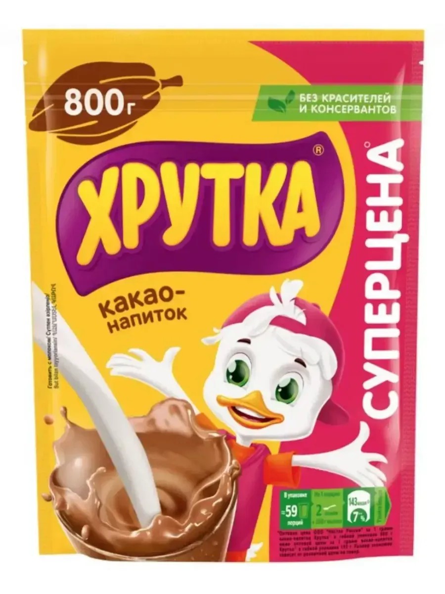 Хрутка какао-напиток 800 гр, 1 пакет. Начать утро с новым какао-напитком Хрутка – так вкусно и увлекательно! Быстро и удобно: добавьте 2 чайные ложки какао Хрутка в стакан молока – и вкусный напиток для завтрака готов! В молоке содержится кальций, необходимый для крепких и здоровых костей. А с нежным шоколадным вкусом какао-напитка Хрутка пить молоко вкуснее. А еще какао-порошок от природы является источником магния, железа и фосфора. C Хрутка весёлый завтрак за минутку!