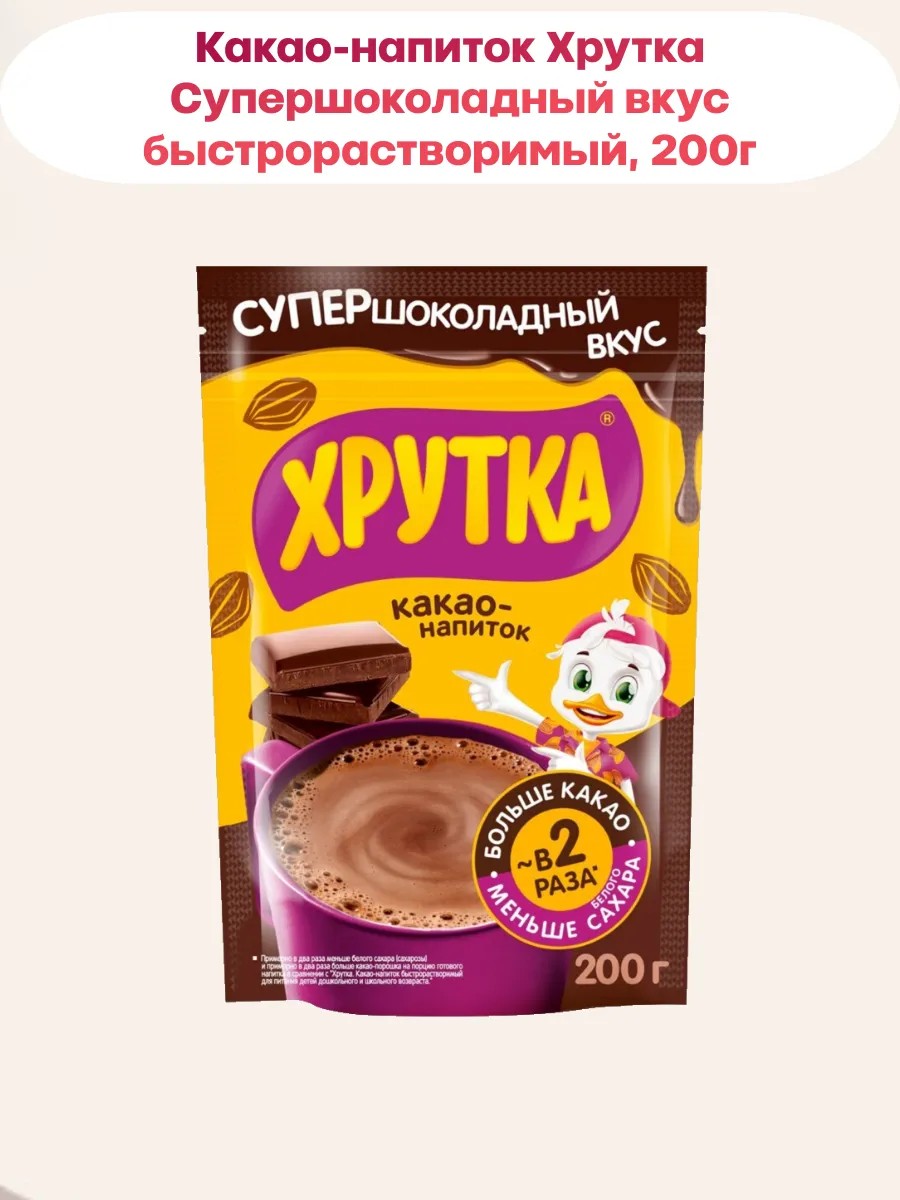 Какао-напиток обладает насыщенным шоколадным вкусом, ведь в нем в 2 раза больше какао и сниженное вдвое количество сахара в порции. Любите варимое какао? Попробуйте хрутка супершоколадный вкус: у этого напитка есть все шансы вам понравиться. Быстро и удобно приготовить. Добавьте по вкусу 2-3 чайные ложки какао-напитка хрутка супершоколадный вкус в стакан горячего молока 200г и насладитесь отличным ярким вкусом какао-напитка. Готовый напиток очень полезен для организма: какао-порошок служит ценным источником магния, железа и фосфора, а молоко содержит кальций, необходимый для укрепления зубов и костей.
