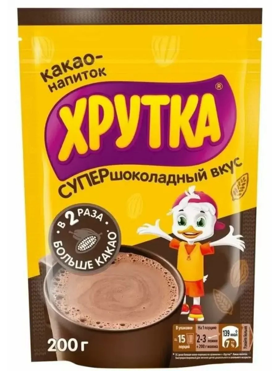 Хрутка Какао-напиток Супер шоколад быстрорастворимый, 200 г, 1 штука. Начать утро с новым какао-напитком Хрутка - так вкусно и увлекательно! Быстро и удобно: добавьте 2 чайные ложки какао Хрутка в стакан молока - и вкусный напиток для завтрака готов! В молоке содержится кальций, необходимый для крепких и здоровых костей. А с нежным шоколадным вкусом какао-напитка Хрутка пить молоко вкуснее. А еще какао-порошок от природы является источником магния, железа и фосфора. Хрутка . Раз, два - и вкусно.