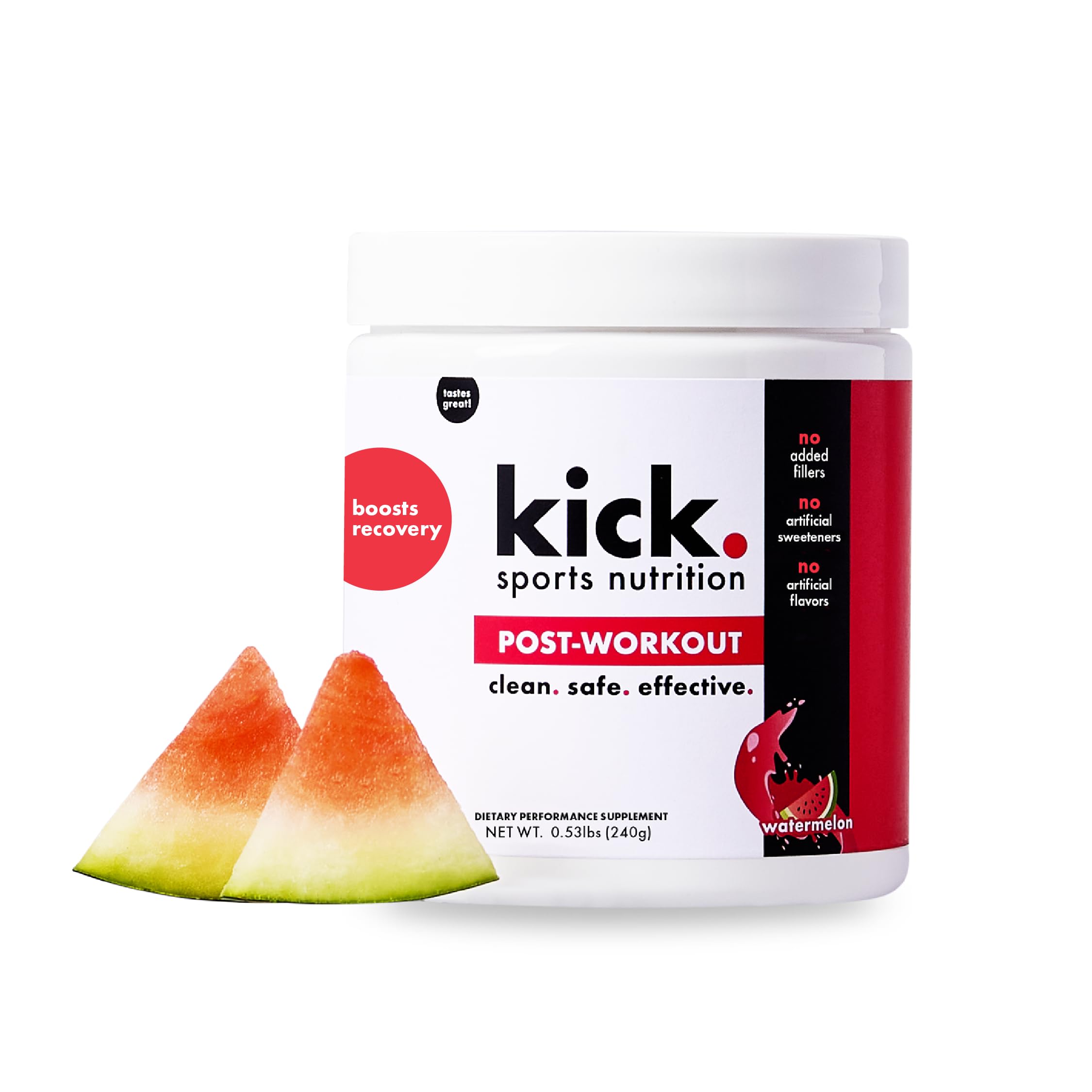 TRY THE COMPLETE KICK WORKOUT ROUTINE: Pair this post workout powder with our pre workout and protein powders to complete your workout supplement routine. Whether you're focusing on endurance, hydration, or muscle growth, our post workout powder provides the clean ingredients and nutrients your body needs to recharge after every training session. HOW TO TAKE: For optimal results, take one scoop of this post workout powder and shake it with water, or blend it with ice for a cool, refreshing smoothie. You can also stir it into water for a quick and easy vitamin surge. With only 20 calories per serving, it's the perfect low calorie option to hydrate and support muscle repair without added sugars or artificial fillers. REFRESHING WATERMELON FLAVOR BLAST: Savor the delicious, naturally flavored watermelon taste that makes each serving of post workout routine feel like an indulgence. No artificial flavors, just clean ingredients to hydrate and replenish your body. ADVANCED AMINO ACID COMPLEX: This post workout powder features a 2:1:1 advanced amino acid complex that supports muscle repair and growth. The blend of amino acids can help reduce muscle soreness and supports strength building after intense training, allowing you to refuel faster and get back to your fitness routine with ease. HYDRATING POST WORKOUT SUPPORT: Refuel after your workout with this clean, safe, and effective post workout powder. With hydrating electrolytes, antioxidants, and no artificial ingredients, it's designed to support muscle renewal, hydration, and overall wellness. Enjoy the refreshing watermelon flavor while replenishing essential nutrients like magnesium, zinc, potassium, and vitamin C to help you recharge.