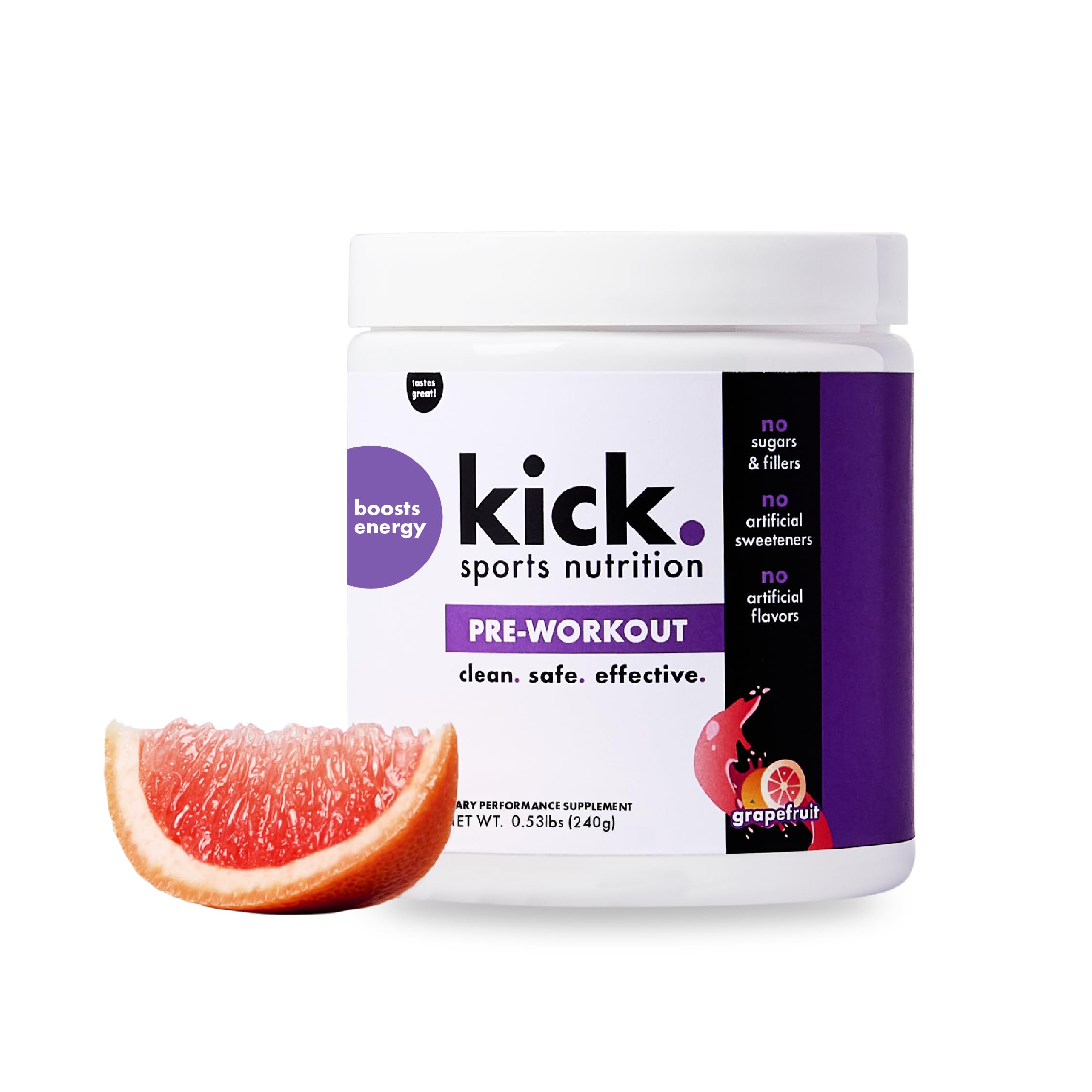 TRY THE COMPLETE KICK WORKOUT ROUTINE: Pair this pre workout with our post workout and protein powders for a complete fitness supplement routine. Whether you're working out for muscle growth or endurance, our pre workout supports your journey with clean ingredients and optimal performance-supporting complexes. HOW TO TAKE: For optimal results, take one scoop of this pre workout powder and shake it with water or blend it with ice for a delicious smoothie. You can also stir it into water for a quick and easy energy surge before your workout. With only 15 calories per serving, it's the perfect low calorie option to energize your workout without the added sugars or fillers. FRUITY GRAPEFRUIT FLAVOR EXPERIENCE: Indulge in the mouthwatering grapefruit flavor that makes each scoop a refreshing pre workout burst. No artificial flavors, just clean, naturally sourced ingredients to complement your workout experience. AMINO ACID COMPLEX FOR MUSCLE GROWTH: Packed with a powerful amino acid blend, including L glutamine and beta alanine, this pre workout supports muscle growth, endurance, and post workout health. The amino acids can help optimize performance during intense workouts, while the energy complex provides the stamina to power through your fitness goals. CLEAN AND EFFECTIVE PRE WORKOUT: Kickstart your workout with this clean, safe, and effective pre workout powder. With no sugars, fillers, or artificial sweeteners, it's designed to support energy levels and workout intensity. Enjoy the refreshing juicy grapefruit flavor while fueling your body with essential amino acids and energy supporting ingredients like L theanine, caffeine, organic beet juice, and green coffee extract.