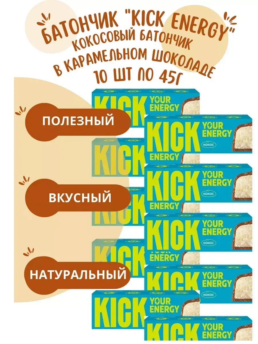 KICK YOUR ENERGY Батончик Кокос в Карамельном Шоколаде 10 штук по 45гр. Кокос укрепляет нервную и гормональную системы, способствует омоложению. Батончики KICK — это находка для самых требовательных сладкоежек, которые хотят баловать себя с уверенностью во вкусе и качестве продукта. Без лактозы. Заряжают энергией надолго. Без рафинированного сахара. 100% чистый растительный состав. Подходят для веганов. Полезный перекус, удобно взять с собой.