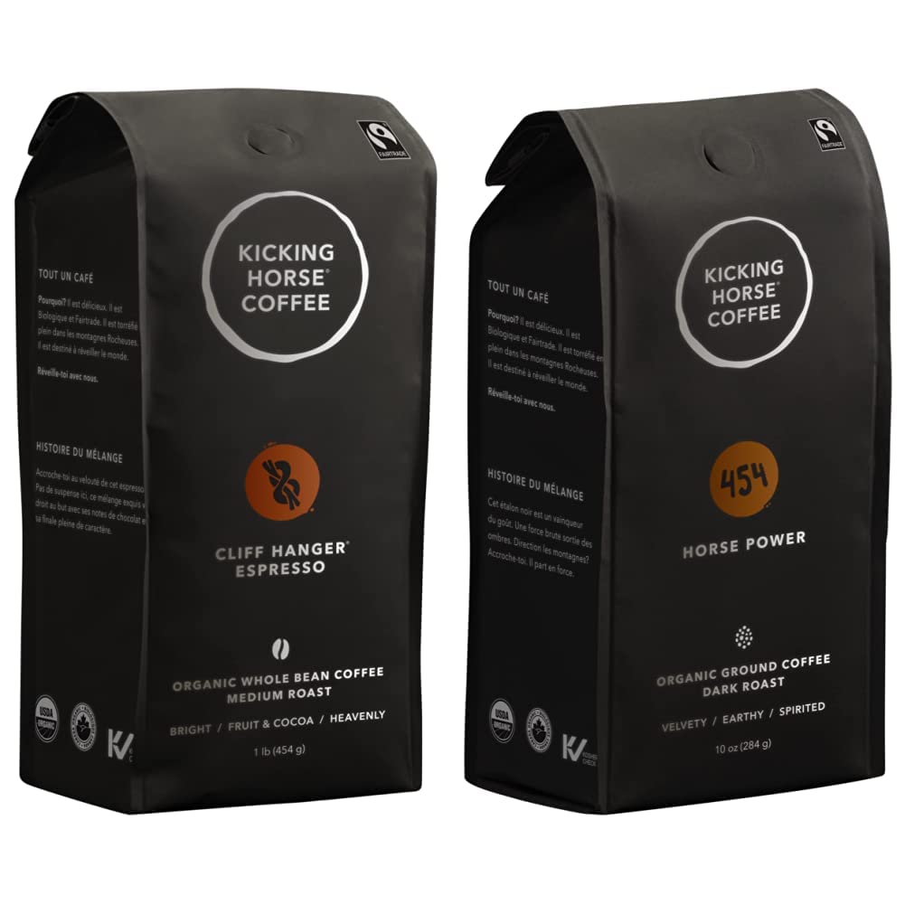 Kicking Horse Coffee, Cliff Hanger Espresso, Medium Roast, Whole Bean, 1 lb - Certified Organic, Fairtrade, Kosher Coffee Bright, fruit cocoa, heavenly. Get a grip on this chocolatey, smooth blend. There's cocoa tones and a bold happy ending. Don't hang in suspense, this blend reads like a manifesto of delicious coffee. Kicking Horse Coffee, 454 Horse Power, Dark Roast, Ground, 284 g - Certified Organic, Fairtrade, Kosher Coffee(Packaging might slight vary) Velvety, earthy, spirited. This smooth riding dark horse conjures up power from the depths of the shadows. This is the winner, the champion of taste. Hop on, hold on, and head for the hills.Product 2: ORGANIC, FAIRTRADE, KOSHER, SHADE GROWN, ARABICA COFFEE: Coffee that is good and fair for the coffee drinkers, the farmers and the planet. 100 percent Certified. Product 2: ORIGIN INDONESIA, CENTRAL SOUTH AMERICA: Grown in a socially and environmentally responsible way, by farmers with sustainable businesses they can depend on. Product 2: TASTING NOTES, BREW METHOD: Heavy body, sweet tobacco, earthy with a black licorice finish. Recommended methods: drip machine, pour over and cold brew. Product 2: DARK ROAST, GROUND: Velvety, earthy, spirited. This smooth riding dark horse conjures up power from the depths of the shadows. This is the winner, the champion of taste. Product 1: ORGANIC, FAIRTRADE, KOSHER, SHADE GROWN, ARABICA COFFEE: Coffee that is good and fair for the coffee drinkers, the farmers and the planet. 100 Certified. Product 1: ORIGIN AFRICA, INDONESIA, CENTRAL SOUTH AMERICA: Grown in a socially and environmentally responsible way, by farmers with sustainable businesses they can depend on. Product 1: TASTING NOTES, BREW METHOD: Silky and complex, wild berry syrup with a smooth cocoa finish. Recommended methods: French press, drip machine, pour over, espresso and cold brew. Product 1: MEDIUM ROAST, WHOLE BEAN: Bright, fruit cocoa, heavenly. Get a grip on this chocolatey, smooth blend. Don't hang in suspense, this blend reads like the manifesto of delicious coffee.
