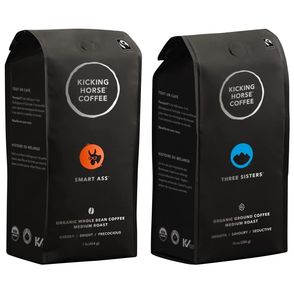 Kicking Horse Coffee, Smart Ass, Medium Roast, Whole Bean, 1 lb - Certified Organic, Fairtrade, Kosher Coffee Cheeky, bright, precocious. A half-full cup of wake up and wise up. No joke here, this is just a bright, chocolatey concoction for the smart-thinking, deep-drinking, good-at-their-game-in-the-morning crowd. Kicking Horse Coffee, Three Sisters, Medium Roast, Ground, 284 g - Certified Organic, Fairtrade, Kosher Coffee Smooth, savoury, seductive. The Three Sisters are a trio of towering Canadian Rocky Mountains. We pay homage to these powerful peaks with a triple punch of light, medium and dark roasts. Great taste hits new heights!Product 2: Organic, Fairtrade, Kosher, Shade Grown, Arabica coffee: Coffee that is good and fair for the coffee drinkers, the farmers and the planet. 100 certified. Product 2: Origin Indonesia, Central South America: Grown in a socially and environmentally responsible way, by farmers with sustainable businesses they can depend on. Product 2: Tasting notes, brew method: Well rounded and complex with notes of sweet tobacco, stone fruit and cocoa. Recommended methods: drip machine, pour over and cold brew. Product 2: MEDIUM ROAST, GROUND: Smooth, savory, seductive. The three sisters are a trio of towering Canadian rocky mountains. Pay homage to these powerful peaks. Product 1: ORGANIC, FAIRTRADE, KOSHER, SHADE GROWN, ARABICA COFFEE: Coffee that is good and fair for the coffee drinkers, the farmers and the planet. 100 Certified. Product 1: ORIGIN AFRICA, CENTRAL SOUTH AMERICA: Grown in a socially and environmentally responsible way, by farmers with sustainable businesses they can depend on. Product 1: TASTING NOTES, BREW METHOD: Tart red currant, notes of sugar cane and milk chocolate, with a honeyed berry body. Recommended methods: French press, drip machine, pour over, espresso and cold brew. Product 1: MEDIUM ROAST, WHOLE BEAN: Cheeky, bright, precocious. A bright, chocolatey concoction for the smart-thinking, deep-drinking, good-at-their-game-in-the-morning crowd.