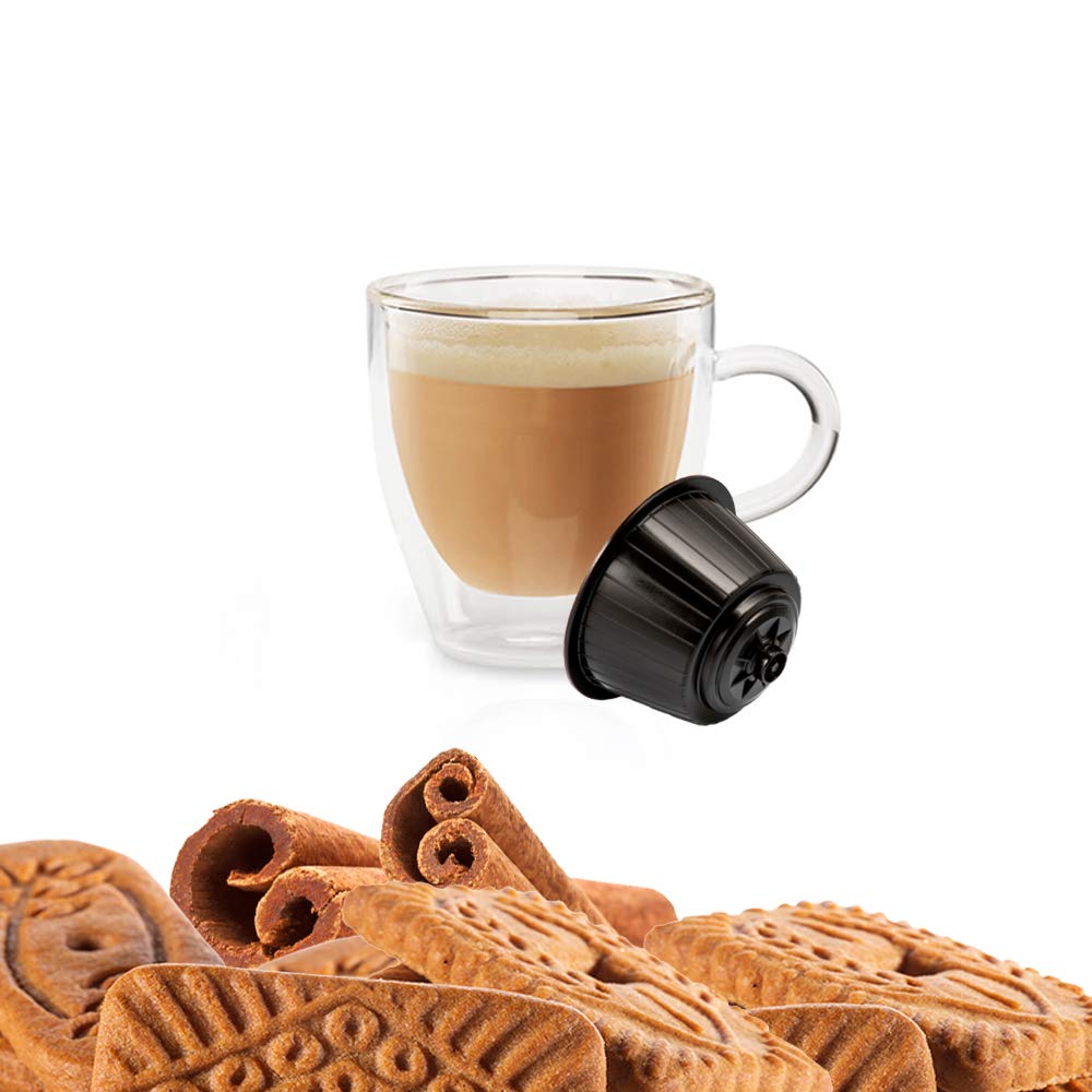 16 Capsules Speculoos Cappuccino Biscuit and Cinnamon. With these capsules compatible with the Dolce Gusto system, prepare a delicious cup of cappuccino and cinnamon biscotti in just a few moments. Ingredients: sugar, skimmed milk powder, whey powder, vegetable fats (coconut), instant coffee (4 ), fat-reduced cocoa powder (3 ), flavorings, salt, caramelized sugar, milk proteins, emulsifying stabilizers E341, E551, E471. Warning: Contains allergens. Dolce Gusto capsules can be used with the following machines: Melody, Genio 2, Mini Me, Piccolo, Drop, Stelia, Jovia, Oblo, Circolo (by De Longhi and Krups), Gustissima (by Must) and many others. The trademarks present are not the property of Kickkick srl or related companies. INSTRUCTIONS FOR USE Insert the capsule into the Nescafé Dolce Gusto machine, then select the Cappuccino mode. Wait for the drink to be prepared. SAFETY WARNING Contains: milk Cappuccino Biscuit and Cinnamon flavor. 16 Speculoos Cappuccino capsules. 16 Capsule Speculoos Cappuccino Biscuit et Cannelle. Avec ces capsules compatibles avec le système Dolce Gusto, préparez en quelques instants une savoureuse tasse de biscotti au cappuccino et à la cannelle. Ingrédients: sucre, lait écrémé en poudre, sérum en poudre, graisses végétales (noix de coco), café instantané (4 ), cacao en poudre allégé en graisse (3 ), arômes, sel, sucre caramélisé, protéines de lait, stabilisants émulsifiants E341, E551, E471. Attention: il contient des allergènes. Les capsules Dolce Gusto peuvent être utilisées avec les machines: Melody, Genio 2, Mini Me, Piccolo, Drop, Stelia, Jovia, Oblo, Circolo (de De Longhi et Krups), Gustissima (de Must) et bien d'autres. Les marques présentes ne sont pas la propriété de Kickkick srl ou de sociétés liées. MODE D'EMPLOI Insérer la capsule dans la machine Nescafé Dolce Gusto, puis sélectionner le mode Cappuccino. Attendez que la boisson soit préparée. AVERTISSEMENT DE SÛRETÉ Contient: lait Saveur Cappuccino Biscuit et Cannelle. 16 capsules Speculoos Cappuccino.