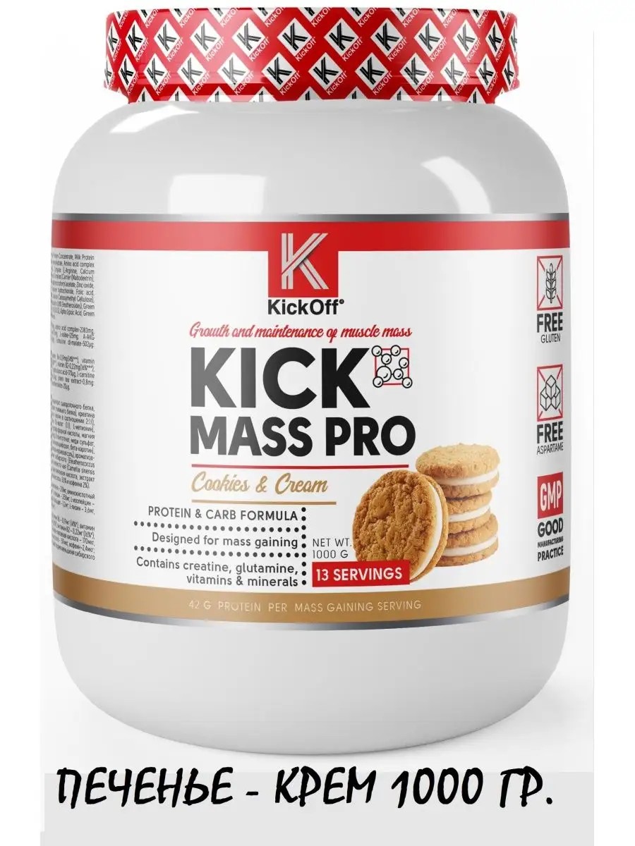 **KICK MASS PRO gainer is a specially developed formula with an optimal ratio of carbohydrates to proteins - for gaining muscle mass!****KICK MASS PRO** contains: **4 protein ingredients**: Whey protein concentrate, milk protein concentrate, calcium caseinate, hydrolyzed beef protein isolate. **3 types of carbohydrates**: dextrose, maltodextrin, fructose. This complex carbohydrate formula ideally provides the energy necessary for gaining muscle mass. **A rich vitamin and mineral complex**, which helps replenish the loss of nutrients and microelements. Additional ingredients included **Creatine** and **AAKG** complex. A set of **branched-chain amino acids (BCAA)** guarantees that your body receives all the necessary ingredients to stimulate muscle growth! **Packaging:** 1000 g - 13 servings **Taste:** Stracitella