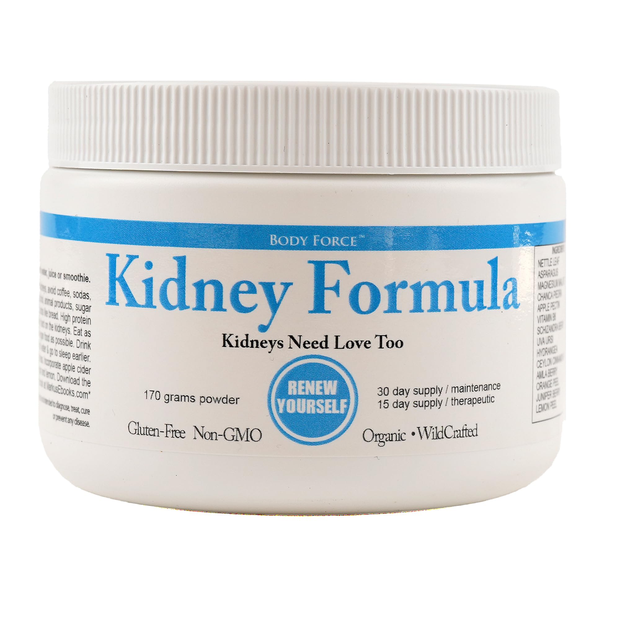 Your Kidneys are Vital! Keep Them Clean! Especially if you eat lots of protein, bread, grains, starches, coffee or sweet foods. Kidneys filter all the blood in your body every hour. Keeping them clean is critical otherwise it's like blocking a superhighway. Everything in your body depends on your kidneys working right. Signs of your kidneys need help: sore lower back, low sex drive, wrinkles, tired a lot, stress, brittle hair and nails, craving sweet foods, peeing a lot, cold a lot, diet of high-protein and animal foods, alcohol, caffeine, not enough sleep and more. Go to MarkusKidneyFormula.com to learn what each herb in this formula does! Help your kidneys by staying away from coffee, sodas, smoking, alcohol, animal products, sugar and refined carbs like bread, pasta and anything made with wheat or flour. High protein diets are very hard on the kidneys. Eat as much raw vegan food as possible and little or no cooked food. Exercise daily, minimize stress. Don't eat 3 hourse before bed. Drink lots of water and go to sleep earlier. Incorporate apple cider vinegar and lemon. Organic ingredients: Nettle Leaf, Asparagus, Chanca Piedra, Magnesium Malate, Uva Ursi , Apple Pectin, Hydrangea, Cinnamon Bark, Schizandra Berry, Vitamin B6, Amla Berry, Orange Peel, Lemon Peel, Juniper Berry