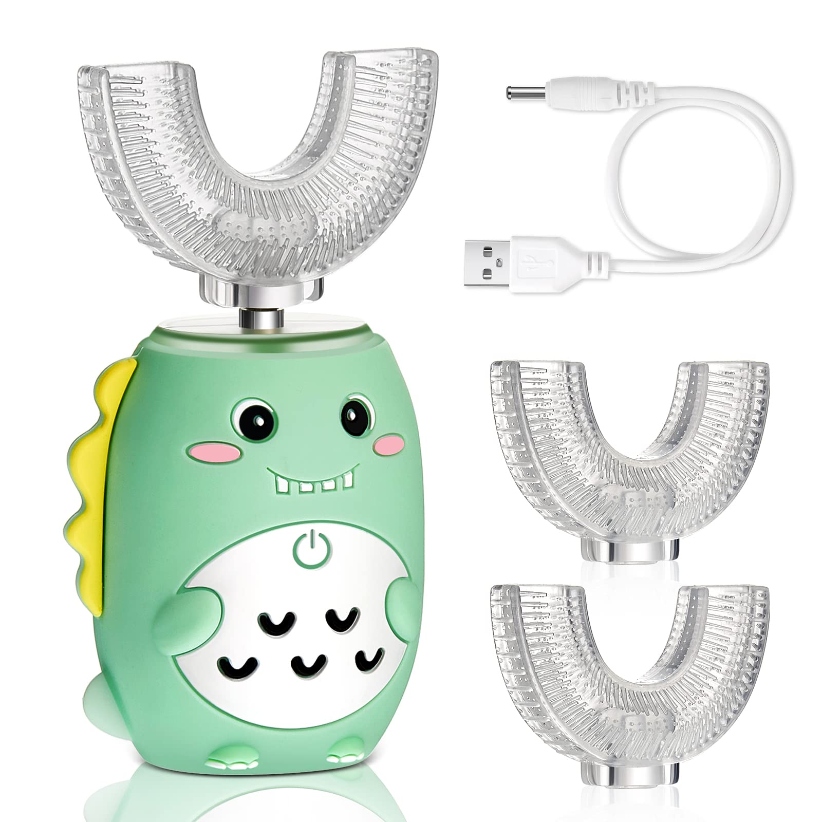 Kids 4inch Electric Toothbrushes U Shaped Ultrasonic Toothbrush Dinosaur Toothbrush Rechargeable Waterproof Toddler Tooth Brush with 2 Brush Heads for Baby 2-12 Years Old, 5 Cleaning Modes (Green)