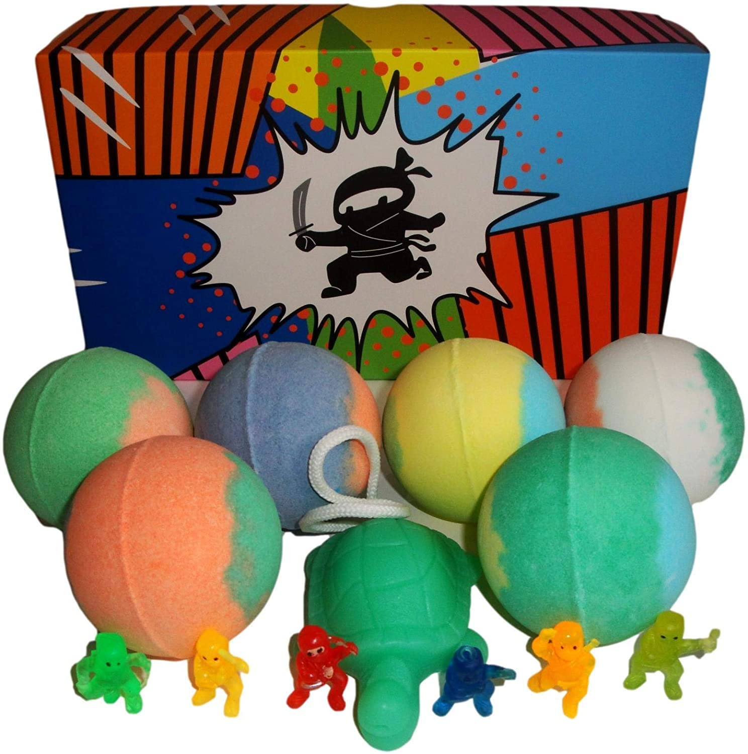100% NATURAL BATH BOMBS THAT WON'T STAIN YOUR TUB - benefit from a product that's entirely natural. NATURAL AND ORGANIC INGREDIENTS - Our bath balms leave your skin hydrated and moisturized. Our unique blend of organic essential oils ensures that they are KID Safe. ORGANIC + HANDMADE + VEGAN - all of our super fun bath bombs are packed with essential oils and are custom crafted for bathtime fun!. EXCITING SURPRISE TOY INSIDE! - Drop it in the tub and watch it fizz, color the water and reveal the mystery inside! Each set contains 6 (six) XL bath bombs of 4.2 oz each with a ninja toy that gets revealed when they fizz out! It is 6 colors and 6 styles in each color. SHOULD BE FUN! Our kids surprise bath bombs are the best way to make bath time fun and exciting! Handmade, organic, and vegan, our kids bath bombs are packed with essential oils for a fun and fragrant surprise!. Blueberry, Pomegranate Cherry Burst, Grapefruit Tangerine, Orange Citrus Explosion, Banana Grapefruit and Kiwi ,LemonGrass-Verbenna.