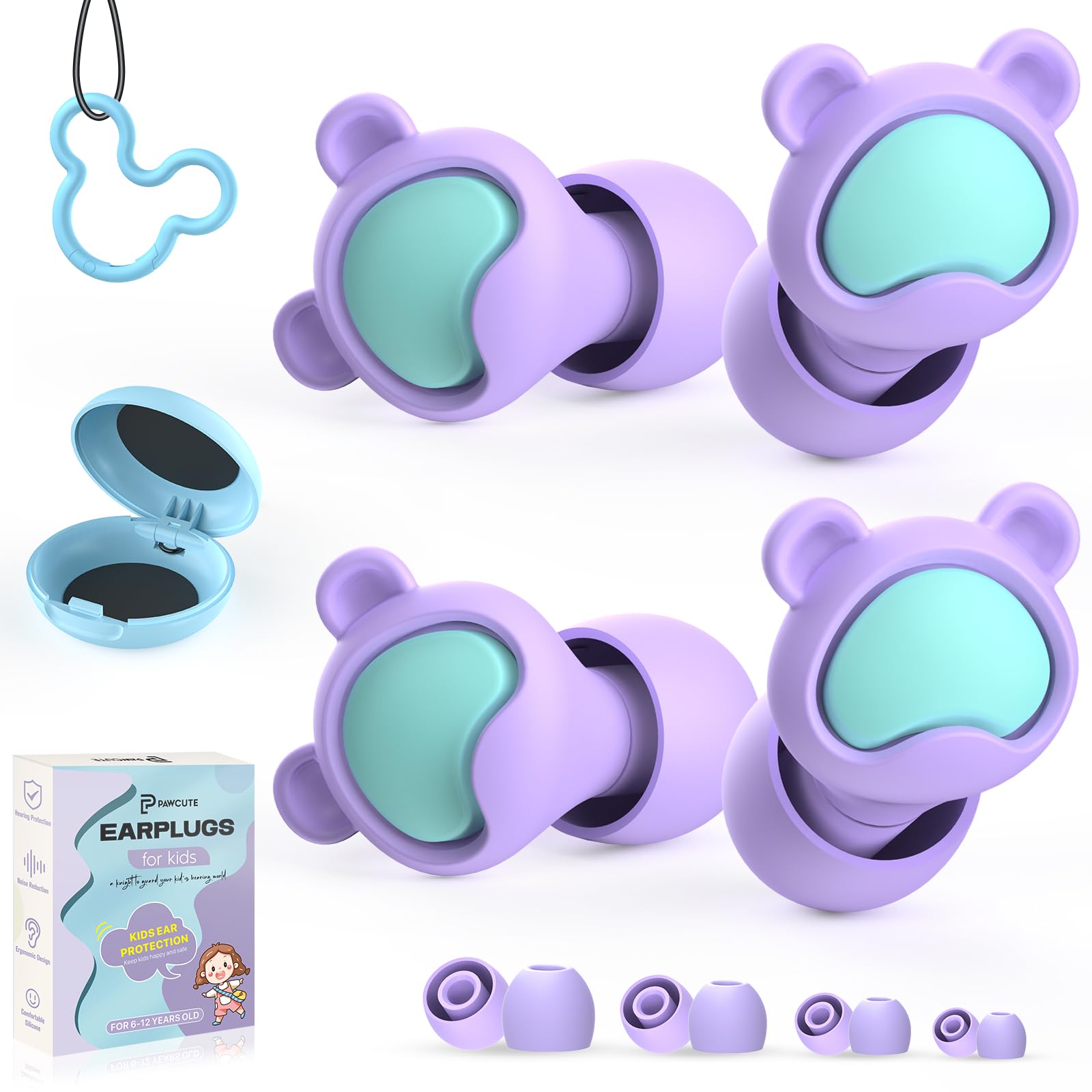 Kids Ear Plugs 2 Pairs(6-12 yrs) Reusable Noise Cancelling Earplugs Silicone Noise Sensitivity Ear Plugs for Children/Small Ears Ear Protection for Concerts/Flying/School/Playtime(Purple+Purple)