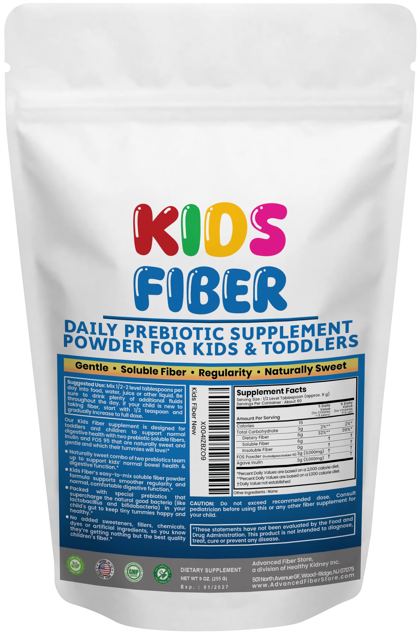 Convenient Kids Fiber Powder! Get soluble dietary fiber while restoring your kids gut health. Fiber pills don't work not enough fiber. Our kids fiber powder supports the growth of beneficial gut flora (lactobacillus Bifidobacterium strains) which are critical for supporting normal movements digestive health. Add to smoothies, yogurt, beverages, bake with it. Complementary User Guide included. Prebiotic Soluble Fiber For Kids! This is not a kids laxative, toddler laxative or children's laxative for fast constipation relief. Kids Fiber is Agave Inulin 95 FOS which are gentle fibers great for kids for their daily fiber intake to support normal bathroom regularity. Its approach to kids gut health promotes a balanced microbiome, aiding in smooth digestion long-term easy movements. Fiber Powder For Kids! Revitalize your kids gut health from within! This kids fiber powder gives gut flora, good probiotics, a helping hand. Kids fiber powder is a safe, effective way to replenish fortify the natural gut flora that supports normal digestion, normal regularity normal gas. The 2 prebiotics also support nutrient absorption, immune health critical nutrients for kids growth. Constipation Relief for Kids Toddlers! 2 soluble fiber prebiotics for kids to support normal digestive function by feeding good bacteria to support toddlers and kids gut health easy potty trips. Mix easily into many foods or beverages, Kids Fiber supports a normal healthy microbiome, kids gut health, bathroom relief, regularity overall well-being. Rebuild their gut for long term regularity. Fiber For Kids! Kids Fiber is 100 soluble, restorative, yet gentle, to support normal easy bowel movements. This fiber for kids is mildly sweet, won't change taste of what it's mixed in, high in kids fiber so more is less gives constipation relief for kids. It's not a laxative for kids. It's a perfect soluble fiber prebiotic for kids that is safe supports normal kids gut health regularity.