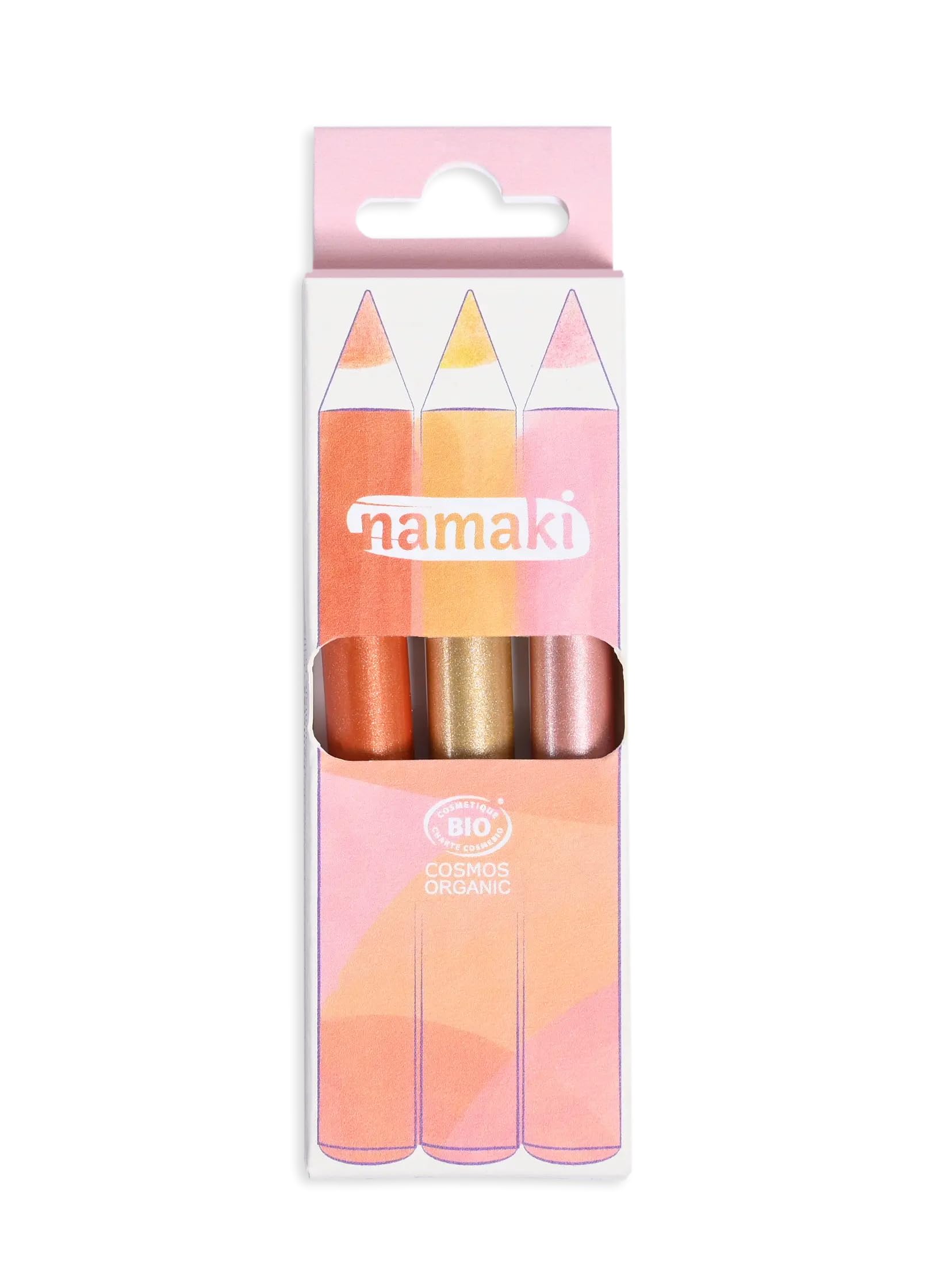 Give yourself a touch of light with this set of 3 Jumbo Glitter Pencils in Copper, Gold, and Pink. These pencils, with their soft and creamy texture, are enriched with organic jojoba oil for a smooth and smudge-free application. Whether for face or body makeup, these pencils guarantee impeccable results while taking care of your skin. Their environmentally friendly Cosmos Organic certified formula is dermatologically tested, ensuring safe use. Makeup removal is simple: a little water, soap, and that's it. These pencils are eco-friendly, with recyclable packaging and a composition based on high-quality natural ingredients. Usable for up to 12 months after opening, they adapt to all your creative desires. In case of a textile stain, washing with water is enough to remove all traces. Don't let the magic fade and enjoy sparkling, organic makeup with Namaki! SAFETY WARNING External use onlyOrganic jojoba soft texture pencils. Cosmos Organic certified makeup pencils. Rose gold copper makeup. Jumbo face and body pencils. Glittery children's makeup. Organic glitter pencils. Offrez-vous une touche de lumière avec cet ensemble de 3 crayons pailletés Jumbo en couleurs Cuivre, Or, et Rose. Ces crayons, à la texture douce et crémeuse, sont enrichis en huile de jojoba bio pour une application fluide et sans bavures. Que ce soit pour un maquillage visage ou corps, ces crayons garantissent un résultat impeccable tout en prenant soin de votre peau. Leur formule certifiée Cosmos Organic, respectueuse de l'environnement, est testée dermatologiquement, assurant une utilisation en toute sécurité. Le démaquillage est simple : un peu d'eau, du savon, et le tour est joué. Ces crayons sont éco-responsables, avec un packaging recyclable et une composition à base d'ingrédients naturels de haute qualité. Utilisables jusqu'à 12 mois après ouverture, ils s'adaptent à toutes vos envies créatives. En cas de tâche sur textile, un lavage à l'eau suffit pour éliminer toute trace. Ne laissez plus la magie s'estomper et profitez d'un maquillage scintillant et bio avec Namaki ! AVERTISSEMENT DE SÛRETÉ Usage externe uniquementCrayons texture douce jojoba bio. Crayons maquillage certifiés Cosmos Organic. Cuivre or rose maquillage. Jumbo crayons visage et corps. Maquillage enfant paillettes. Crayons pailletés bio.