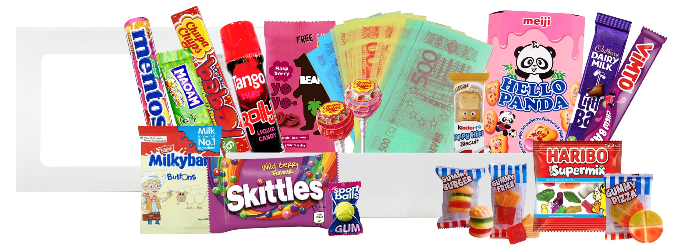 Prepare your taste buds for an unforgettable rollercoaster of flavors! Inside this enchanting hamper, you'll find a captivating blend of sweet, sour, and creamy. Explore from the variations of 2 Chewits Vimto Chew Bar 18g, 1 Skittles Mixed Berry 45g, 1 Mentos Fruits Roll 38g, 1 Chupa Chups Big Babol Strawberry Flavour Soft Bubble Gum 20g, 1 Haribo Kiddies Supermix 16g, 1 Meiji Hello Panda Strawberry50g, 1 Dairy Milk Little Bars 18g, 1 Bear Yo Yo Raspberry 20g, 1 Crazy Candy Factory Mini Gummy Burgers 10g, 1 Gummy Pizza, 1 Gummy Mini Fries, 1 Tennis Balls Liquid Filled Bubblegum, 1 Crazy Candy Factory Edible Paper Funny Money 10g, 1 Maoam Bloxx Strawberry, 1 Tango Roller Licker, 1 Kinder Happy Hippos Hazelnut 20.7g, 1 Milkybar White Chocolate Buttons 30g, 2 Chupa Chups Lollipops 10.5g and let the flavors pop!Perfect for Gifts and Sharing: This delightful hamper isn't just about personal indulgence it's about making moments sweeter. Whether it's a birthday celebration, a school treat, or a simple gesture to brighten someone's day is the perfect choice. Unwrap Happiness: The final act of this sweet symphony includes some iconic favorites and unique treasures, all guaranteed to leave your child beaming with delight, and watch as smiles light up the room. A Carnival of Snacking Pleasure: With a mix of classic modern favorites, this hamper is sure to win hearts of kids kids-at-heart alike. These treats are more than candies they're the ingredients for creating lasting memories spreading joy. Milkybar White Chocolate Buttons are sweet, creamy, and simply irresistible. The smooth and creamy goodness of Dairy Milk, now in adorable mini bars. Say hello to these delightful hello panda biscuits filled with creamy strawberry goodness. Each bite is a tiny adventure of flavor and fun. Kinder Happy Hippos are the epitome of indulgence. Taste the rainbow with Skittles, Mentos Fruit Roll, Vimto Chew Bar, Big Babol Strawberry Gum, Haribo Supermix, Bear Yo Yo Raspberry, Chupa Chups Lollipop! It will give you a zesty burst of fruitiness will have your child grinning from ear to ear. Add some whimsy to your snacking with mini gummy burgers, gummy pizzas, mini fries, liquid-filled bubblegum tennis balls! They may look like mini meals, but you're in for a treat. A fun twist on classic gummies. Childhood Nostalgia: Picture a basket brimming with happiness, a treasure of delectable delights that will transport you back to your fondest childhood memories. This is a collection that's not just about candies it's about embracing pure joy.