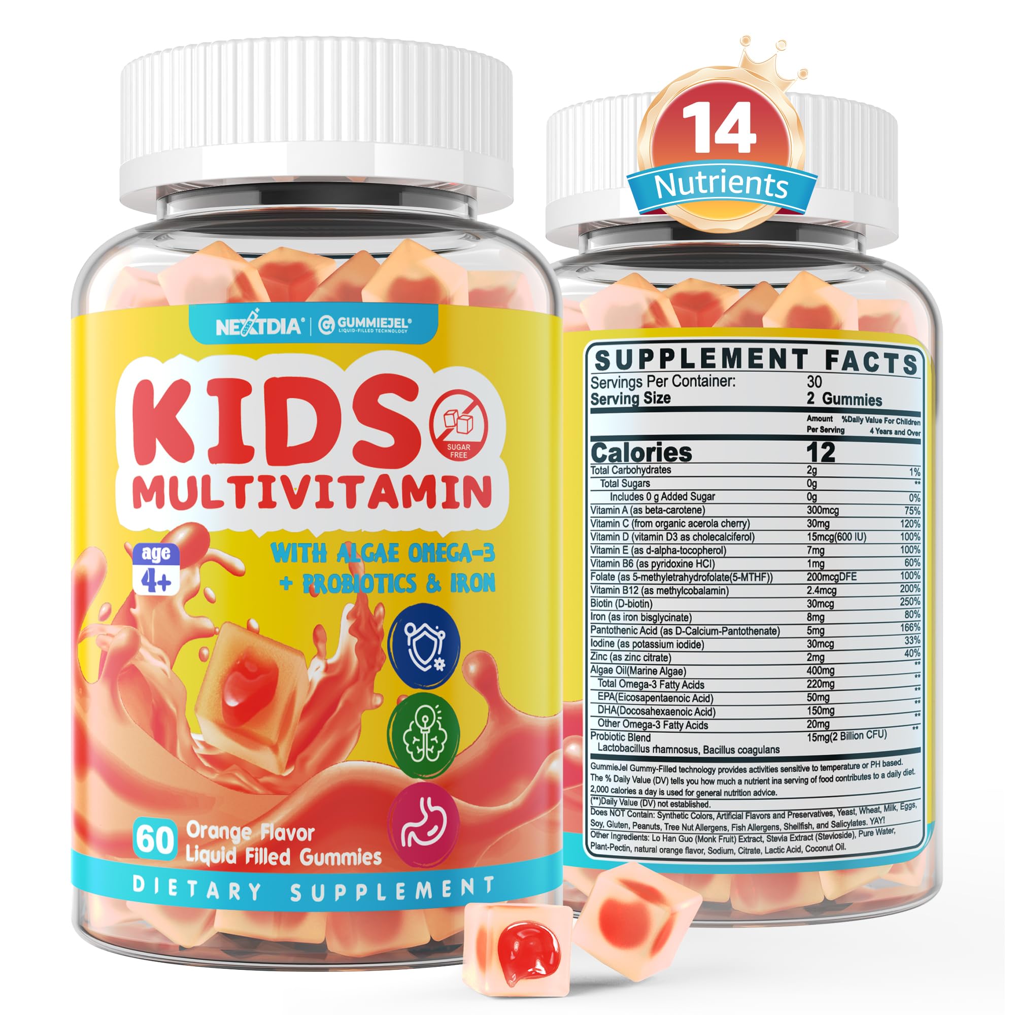 cGMP Certified, Trustworthy Nextdia's kids supplements are non-GMO and free from gluten, containing zero sugar and no artificial sweeteners. do not contain the top 14 Allergens, are produced to the highest standards, vegan, encapsulated, bottled tested in cGMP compliant facilities. Meticulously sourced, made, and tested for purity and potency, they also have no fillers or fake sugars. We're confident that you'll kids will love these healthy kids' gummies - if not, we will promptly resolve them. Unique GummieJel Technology Nextdia children's liquid-filled mulvitamin gummies feature a gelatin-free chewy outer layer and liquid center. Adopting GummieJel Technology separates vitamins and minerals between the core and outer shell, ensuring maximum potency and stability by protecting them from oxidation, temperature, and pH changes. Additionally, it wraps lipophilic nutrients, such as omega-3 to make them easier to absorb. Tooth Friendly Gummies, Tasty Value End the struggle with pills or capsules and get your kids excited about vitamins! Nextdia kids' vitamins gummies have a juicy center that bursts open with delicious liquid and zero sugar. Sweetened with natural Monk Fruit (Luo Han Guo) extract and natural orange flavors, no high fructose corn syrup, and no synthetic dyes. Just 2 gummies daily make taking vitamins fun and easy for your child (even a picky eater), without the negative effects of sweeteners. Smarter Minds Happier Tummies Nextdia kids vitamin multivitamin includes Omega-3s from marine algae with a 1:3 EPA to DHA ratio—just right to support memory, focus, and healthy brain development. This ratio helps your kid get more DHA, the crucial nutrient for growing brains. We've also added two kid-friendly probiotic strains to balance gut bacteria, aid digestion, and support immunity. With Nextdia, kids get the brain and tummy support they need to grow up smart, strong, and full of smiles!. Daily Wellness for Kids on the Grow Your little ones are growing fast, and their nutritional needs keep up! Nextdia kids complete formula delivers 14 essential nutrients, including vitamins A, C, D, E, methylated B-vitamins, and key minerals like iron, iodine, and zinc. We've also added vegan Omega-3s from algae plus gentle probiotics to support digestion, immunity, and overall development. It's everything your little one needs to thrive, packed into one delicious, parent-approved gummy!.