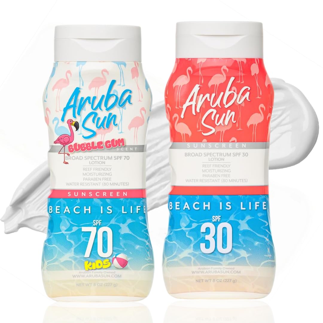 Kids SPF 70 Bubble Gum Sunscreen & SPF 30 Sunscreen Lotion Bundle | Reef Safe Water-Resistant Non-Greasy Broad Spectrum UVA/UVB Protection | Aruba Reef Act Compliant 8 oz Each