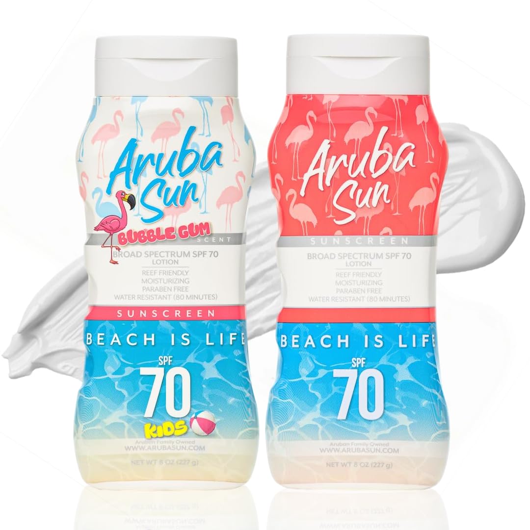 Kids SPF 70 Bubble Gum Sunscreen & SPF 70 Sunscreen Lotion Bundle | Reef Safe Water-Resistant Non-Greasy Broad Spectrum UVA/UVB Protection | Aruba Reef Act Compliant 8 oz Each