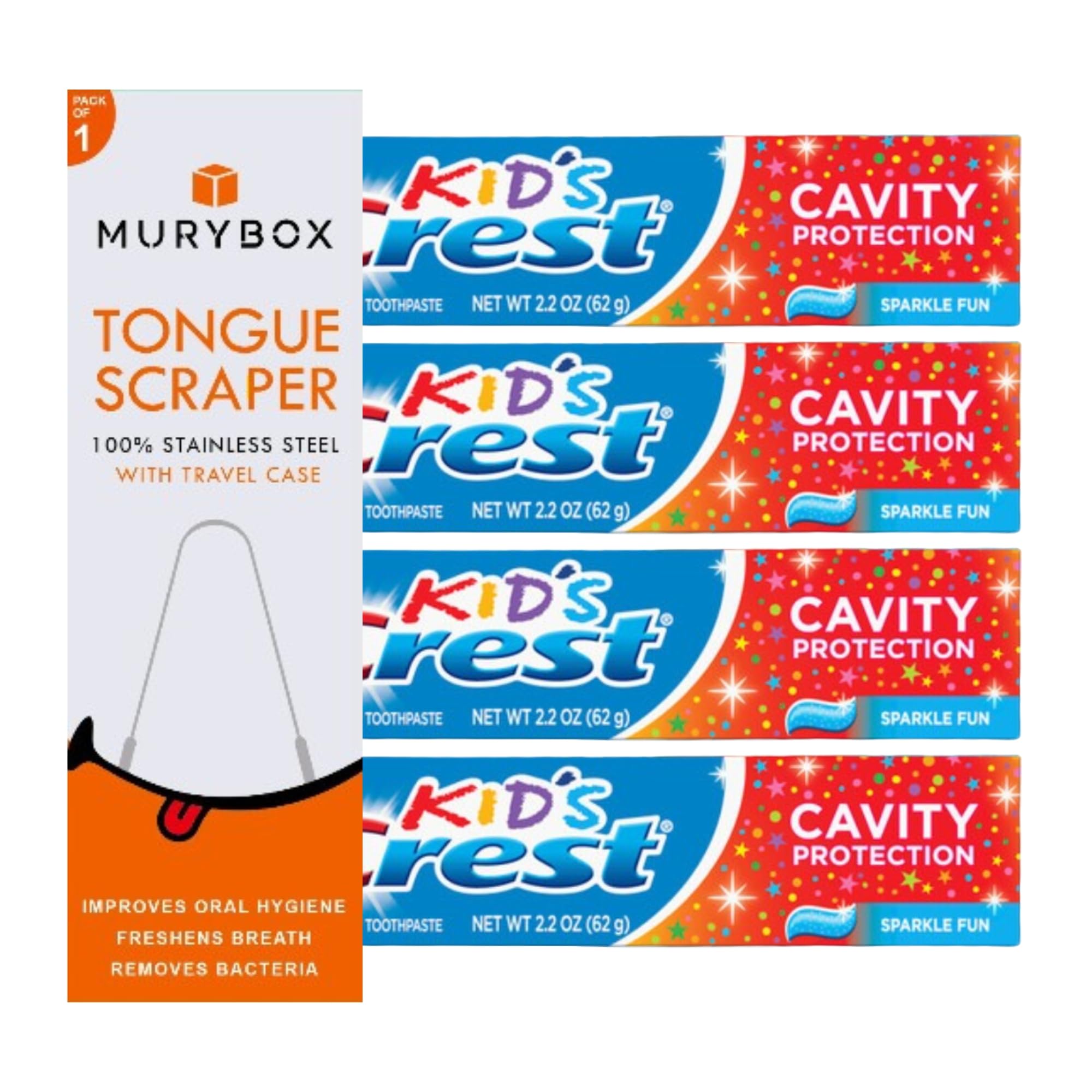 Kids Toothpaste Sparkle Fun 2.2 oz (Pack of 4) - Toothpaste with Fluoride Cavity Protection + Tongue Scraper with Travel Case