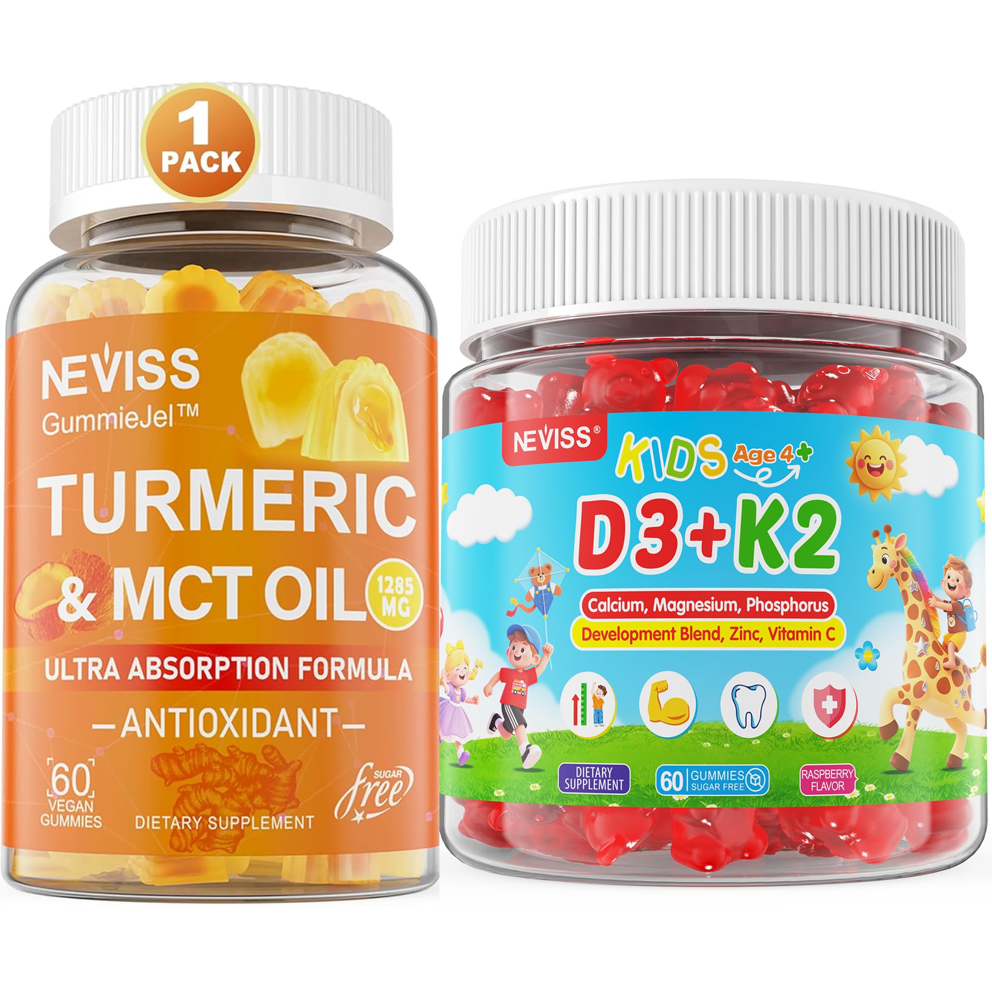 Kids Vitamin D3 K2 Gummies 2 Pack + Sugar Free Turmeric Gummies 1 Pack