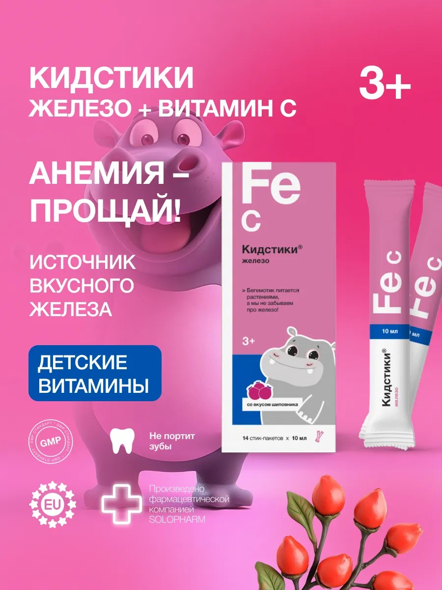 Железо является критически важным минералом, который играет ключевую роль в развитии и функционировании организма ребенка. Оно активно участвует в формировании гемоглобина, необходимого для транспортировки кислорода в клетки, а также способствует нормальному развитию мозга. В Кидстиках используется бисглицинат железа, который обладает высокой биодоступностью и лучше усваивается, обеспечивая максимальную отдачу без риска побочных эффектов.