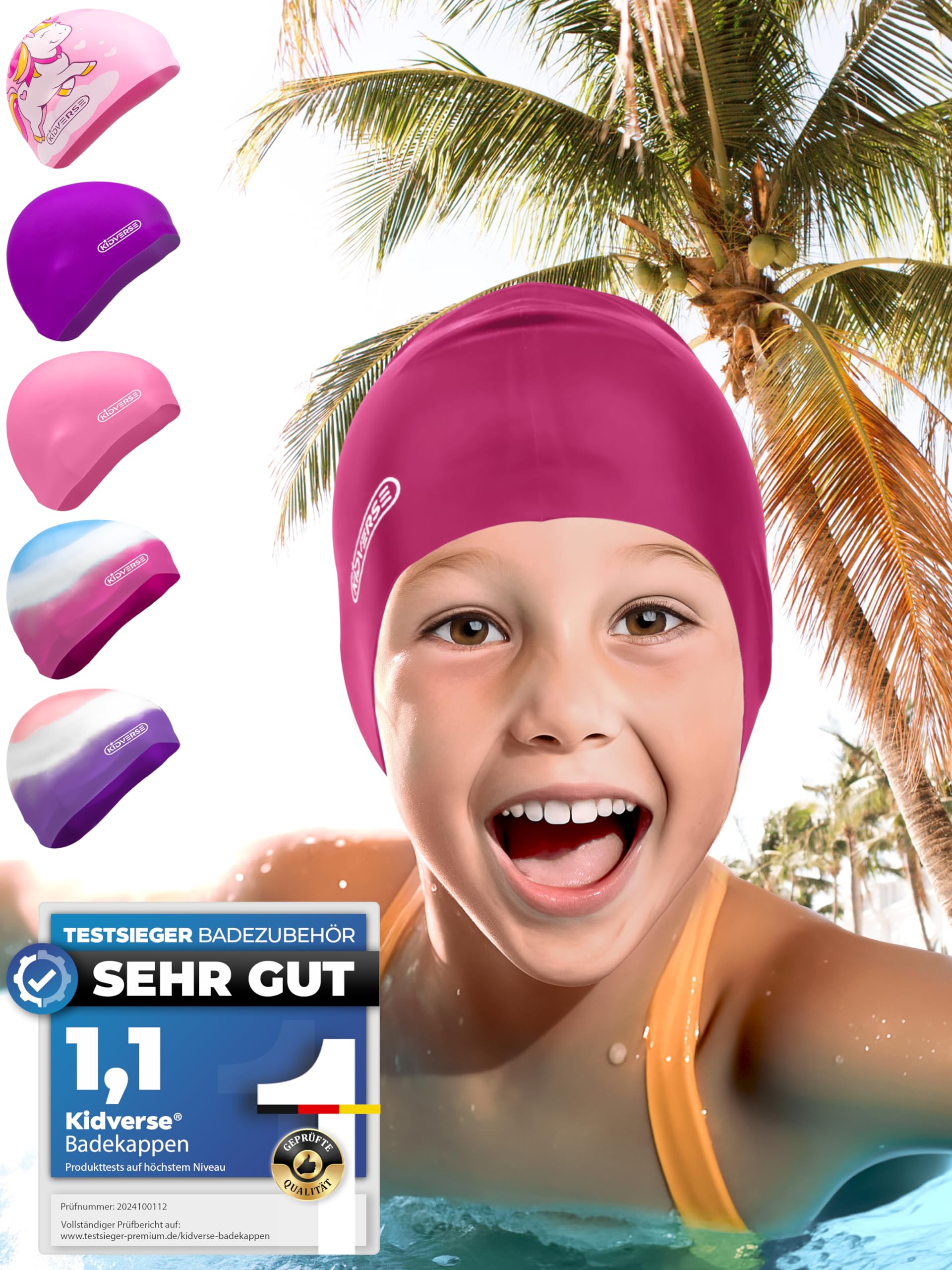 KIDVERSE SERVICE: Sollte es Probleme mit der Schwimm Mütze für Kinder geben oder du Fragen zu unseren Produkten hast, zögere bitte nicht uns zu kontaktieren. Wir sind jederzeit für dich erreichbar finden immer eine zufriedenstellende Lösung. HAUTFREUNDLICH: Unsere Badekappe für Kinder besteht aus haut- haarfreundlichem Silikon. Außerdem schützt die wasserdichte Badekappe Kinder vor schädlichen UV-Strahlen und trägt zu langanhaltendem Spielspaß am und im Wasser bei. 100 WASSERDICHT: Unsere Badekappen für Kinder schützen die Haare Ohren effektiv vor eindringendem Wasser. Der Spaß im Wasser bleibt dadurch bestehen somit lässt die Schwimmmütze Kinder Augen dauerhaft strahlen. EINFACHES ANZIEHEN: Durch das elastische reißfeste Silikon, ist die Bademütze Kinder leicht schnell anzuziehen. Unsere Badehauben eignen sich somit für den Gebrauch im Pool, am Strand als Badekappen für Schwimmer im Schwimmunterricht. 100 TRAGEKOMFORT: Unsere Kinder Badekappe mit optimaler Passform ist im Inneren mit praktischen Anti-Rutsch-Noppen ausgestattet. Diese gewährleisten bei unseren Badekappen für Mädchen einen sicheren Halt maximalen Komfort beim Schwimmen.