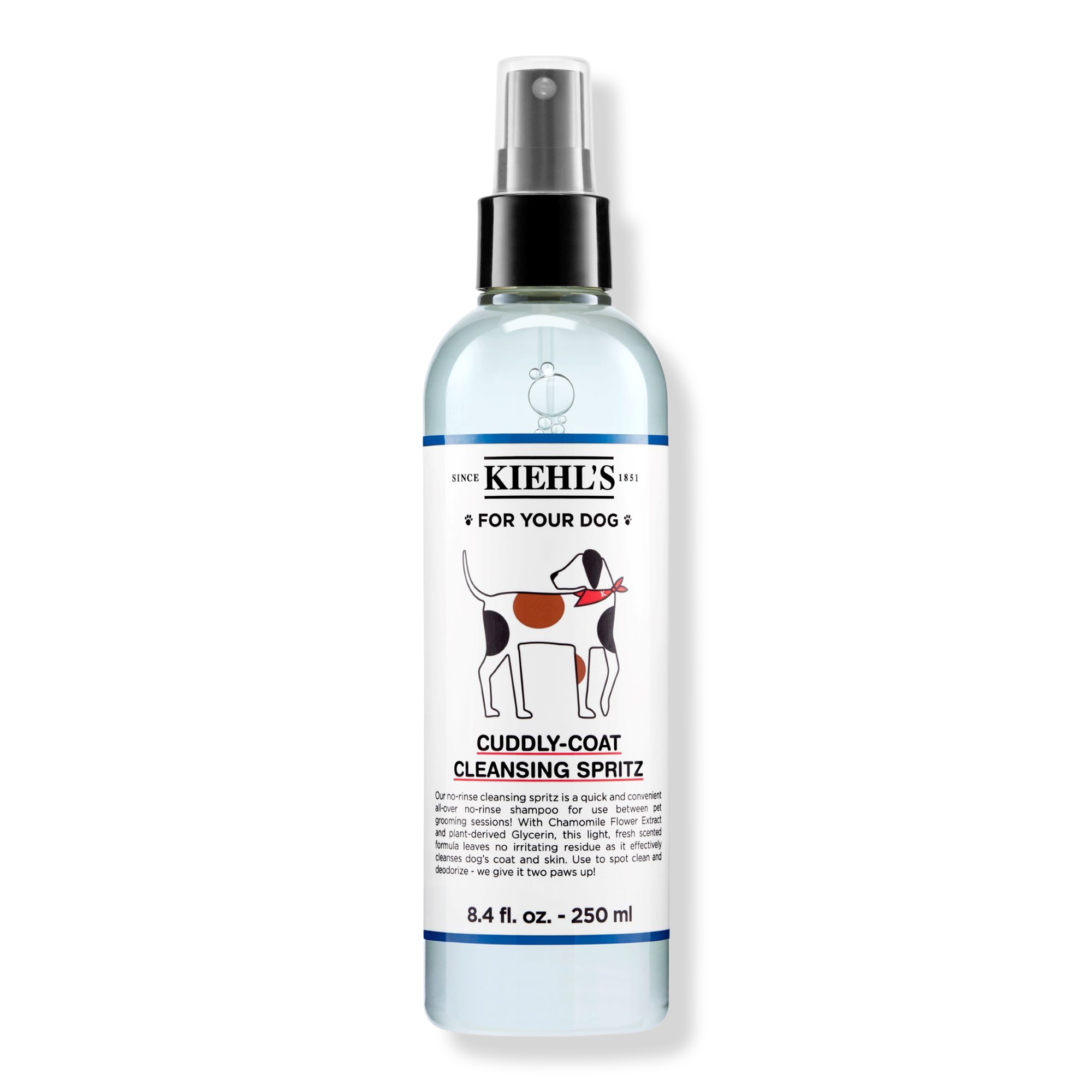 The Kiehl's Since 1851 Cuddly-Coat Cleansing Spritz helps spot clean and deodorize pups on the go. Use this all-over, no-rinse dog cleansing spray between pet grooming sessions for a healthy-looking shine. Give your dog's coat a quick refresh with theKiehl's no-rinse dog grooming spray.