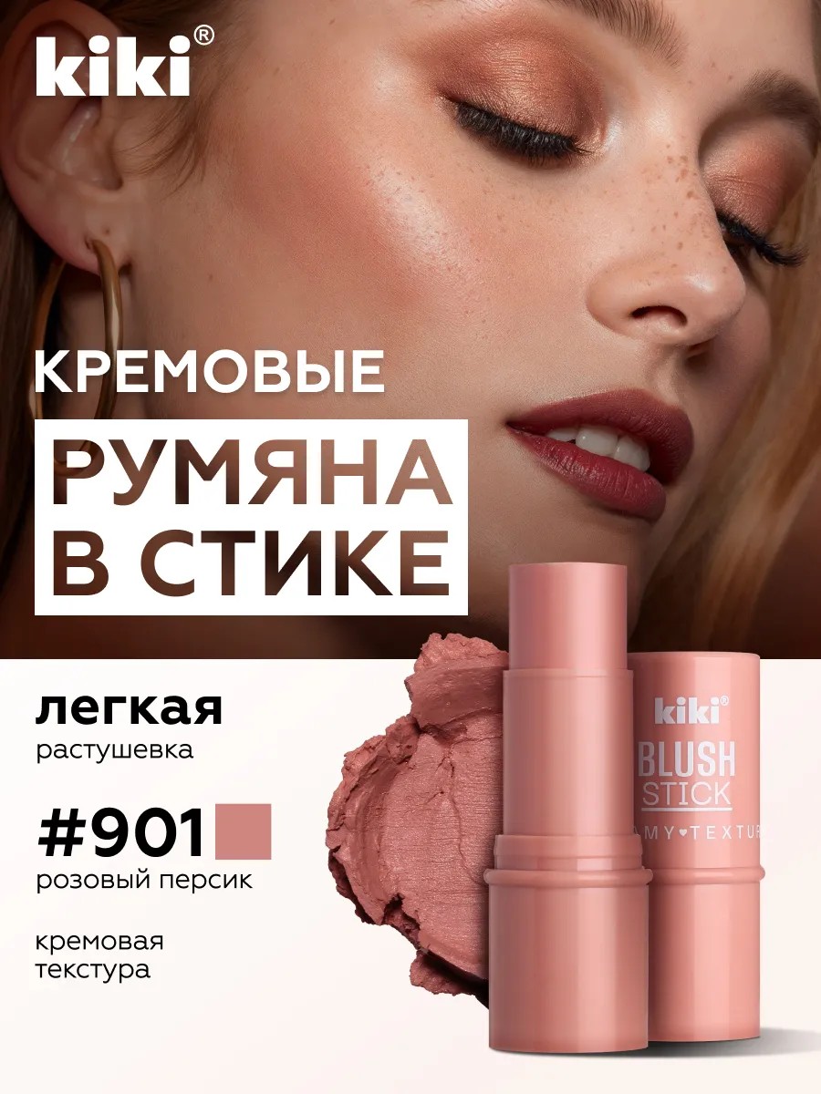 The new KIKI BLUSH STICK cream blush is the perfect product for everyday makeup. This compact stick blush allows you to easily apply the desired shade to the desired areas of the face, highlighting the skin's natural freshness and healthy color. Its soft texture allows for effortless blending, ensuring even color distribution and all-day wear. The blush can be used without a brush—simply swipe the stick over the skin and lightly blend with your fingers or a special brush. This format is especially convenient for travel or when you need a quick touch-up on the go. This cream blush highlights the desired areas of the face, creating a natural glow and defining contours. This budget-friendly product combines practicality with the quality of expensive makeup. It's perfect for both beginners and seasoned makeup enthusiasts. KIKI BLUSH STICK cream blush allows you to create a subtle daytime look or accentuate your evening makeup. The stick format makes it easy to use and compact – it fits easily even in a small makeup bag. No special application skills are required: simply swipe the stick over the desired areas of the face and blend the color for a natural shade. Cream blush is an excellent choice for those who value ease and speed of makeup application without sacrificing the quality of the result. It will highlight cheekbones, give your face a fresh look, and enhance your natural beauty. The product's long-lasting effect ensures that the effect lasts until evening, even with an active lifestyle. Use KIKI BLUSH STICK on its own or as a complement to other makeup – it pairs beautifully with foundations and powders. The convenient stick format allows you to always have it on hand for quick makeup touch-ups throughout the day. This cream blush is ideal for those who want to look well-groomed every day without the hassle.