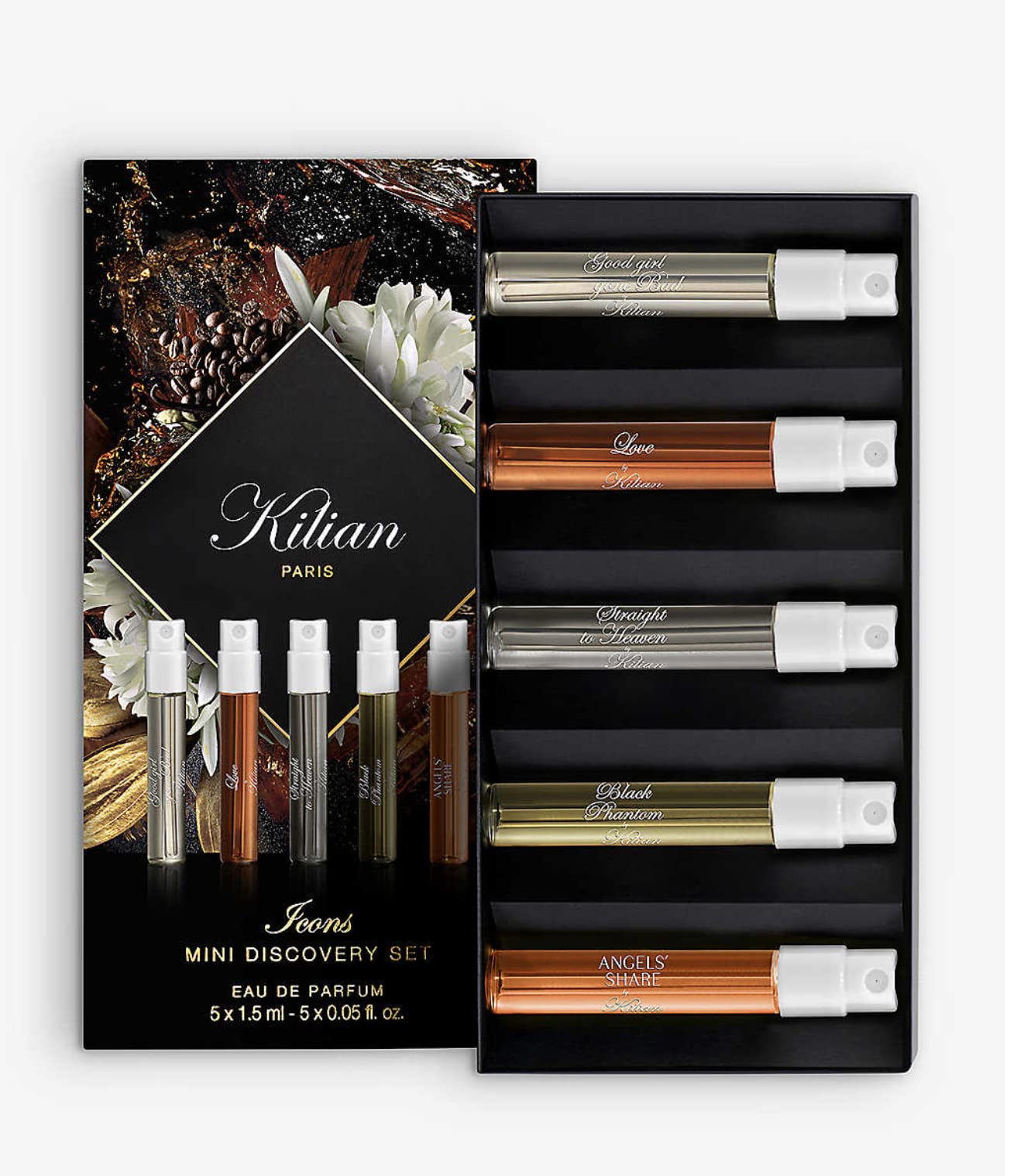 NEW LIMITED EDITION _ KILIAN Paris introduces this mini discovery set gathering five of its most iconic perfume creations. This Set Contains: - 0.05 oz/ 1.5 mL Angels Share Eau de Parfum - 0.05 oz/ 1.5 mL Good Girl Gone Bad by KILIAN - 0.05 oz/ 1.5 mL Love, Don’t Be Shy - 0.05 oz/ 1.5 mL Straight to Heaven, White Cristal - 0.05 oz/ 1.5 mL Black Phantom - "Memento Mori"