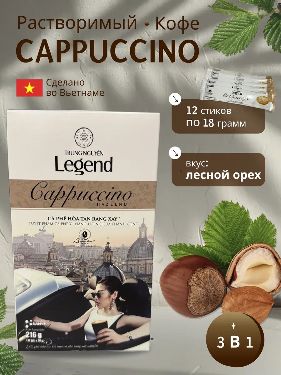 Комплектациярастворимый вьетнамский кофе капучино; вкус лесной орех; капучино; вьетнамский кофе; 12 стиков по 18 грамм