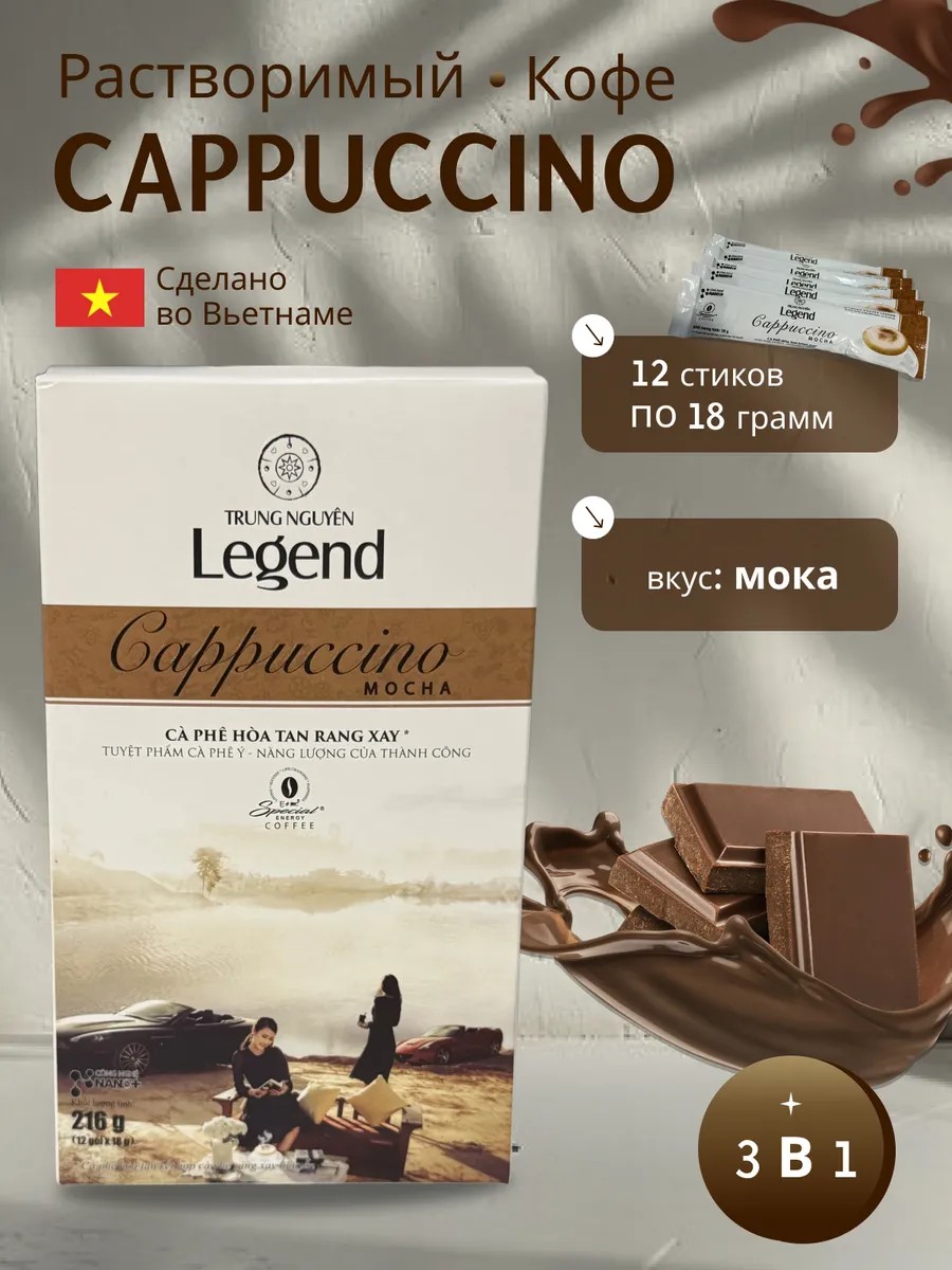 Комплектациярастворимый вьетнамский кофе капучино; Вкус шоколада; мокко; капучино; 12 стиков по 18 грамм; вкус мокко; вьетнамский кофе