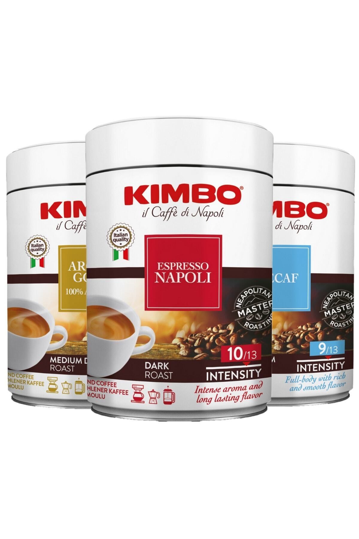 Kimbo Aroma Gold + Espresso Napoli + Decaffeinato Filter Coffee Canister (250 Gr)