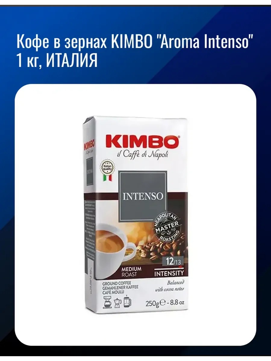 Количество упаковок: 1 шт., Количество в упаковке: 1 шт., Натуральный жареный кофе в зернах KIMBO "Aroma Intenso" – это прекрасный итальянский кофе с характерной обжаркой, которая придает напитку богатый, интенсивный вкус и притягательный аромат.Натуральный жареный кофе в зернах KIMBO "Aroma Intenso" – это прекрасный итальянский кофе с характерной обжаркой, которая придает напитку богатый, интенсивный вкус и притягательный аромат.. Масса нетто: 1000 г; Степень обжарки: средняя; Сорт зерна: 20% робуста, 80% арабика; Тип кофе: зерновой; Срок годности: 24 мес.; Вкус: Aroma Intenso; Серия: Aroma Intenso; Фирма-производитель: Kimbo S.p.A.; Упаковка: вакуумный пакет