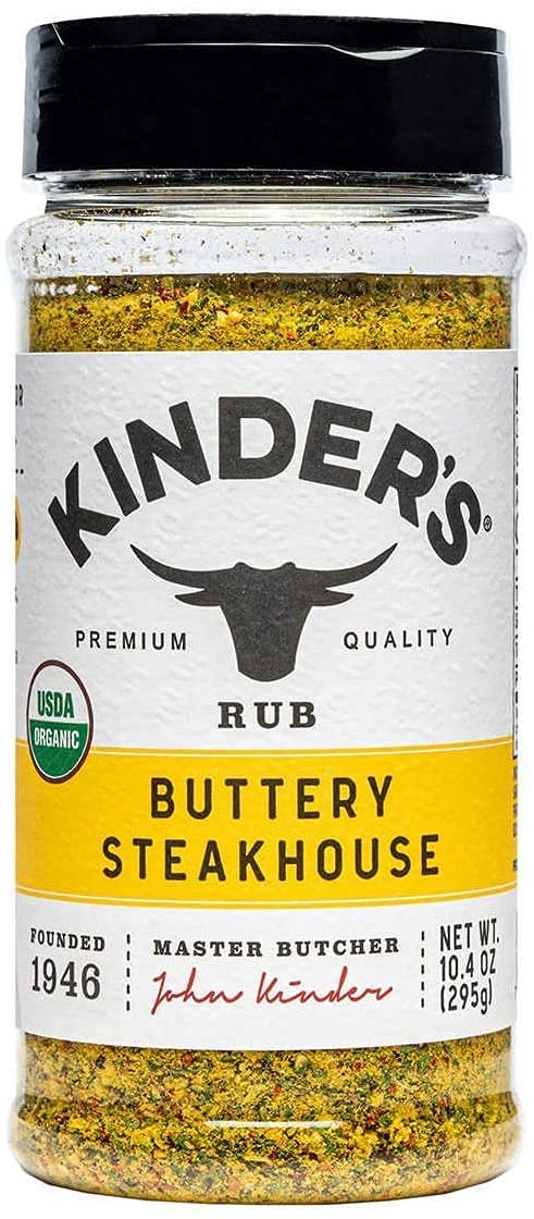 NEWEverything tastes better with Kinder's. Rub on poultry, beef, and seafood. USDA Organic. Kinder's newest rub. Kinder's Buttery Steakhouse Seasoning Rub 10.4 oz.