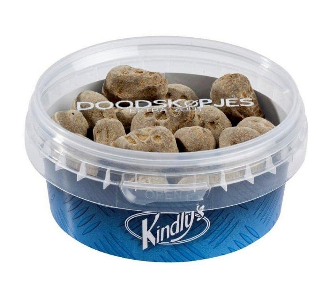 Kindly Skulls. Convenient to always have at home. All for rest and health. For a balanced state. INGREDIENTS Sugar, glucose syrup, salmia salt, licorice root extract, flavoring, color: E153. Nutritional value per 100 grams: Energy 1550 kJ 370 kcal, Fat 0.1 gram (of which saturates 0.1 gram), Carbohydrate 91 grams (of which sugars 71 grams), Protein 0.1 gram, Salt 0.001 gram. Contains licorice people with hypertension should avoid excessive consumption. Store at room temperature (10-20 C) in a dry place. Manufacturer: Van Vliet The Candy Company, Postbus 178, 2400 AD Alphen aan den Rijn