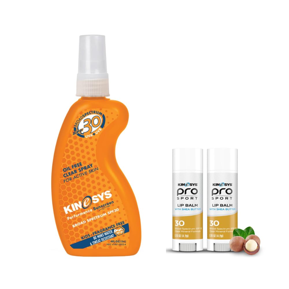 KINeSYS SPF 30 Sunscreen and Lip Balm Bundle Kids Fragrance-Free Spray Sunscreen (4 Fl Oz) and Pro Sport SPF 30 Lip Balm (Pack of 2) Broad Spectrum UVA/UVB Protection for Sensitive Skin & Outdoor