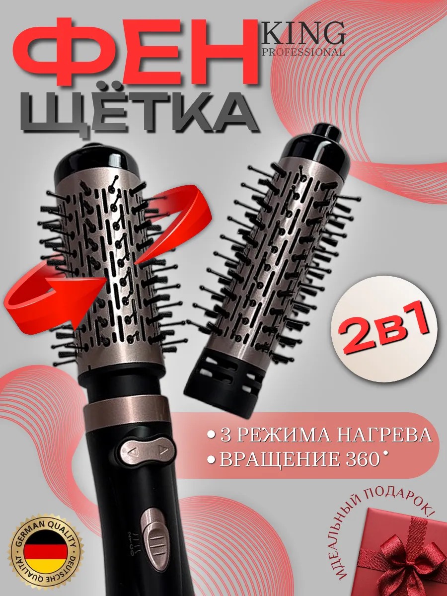 Профессиональная вращающаяся фен - щетка King Professional, мощностью 2000 Вт имеет в комплекте 2 насадки, что позволяет использовать ее на волосах разной длины. Равномерное распределение воздуха по всей поверхности насадки обеспечивает быструю и качественную сушку и укладку. Фен-щетка имеет 2 направления вращения, 2 скорости температуры нагрева и режим подачи холодного воздуха. Гибкие натуральные щетинки фена - расчески имеют безопасные кончики покрытые эпокситной смолой, а технология ионизации сделает волосы послушными и снимет статическое электричество. Съемный фильтр и моющиеся насадки упрощают уход за феном для волос, а длинный, гибкий сетевой шнур, позволяет комфортно работать на большом расстоянии от розетки.
