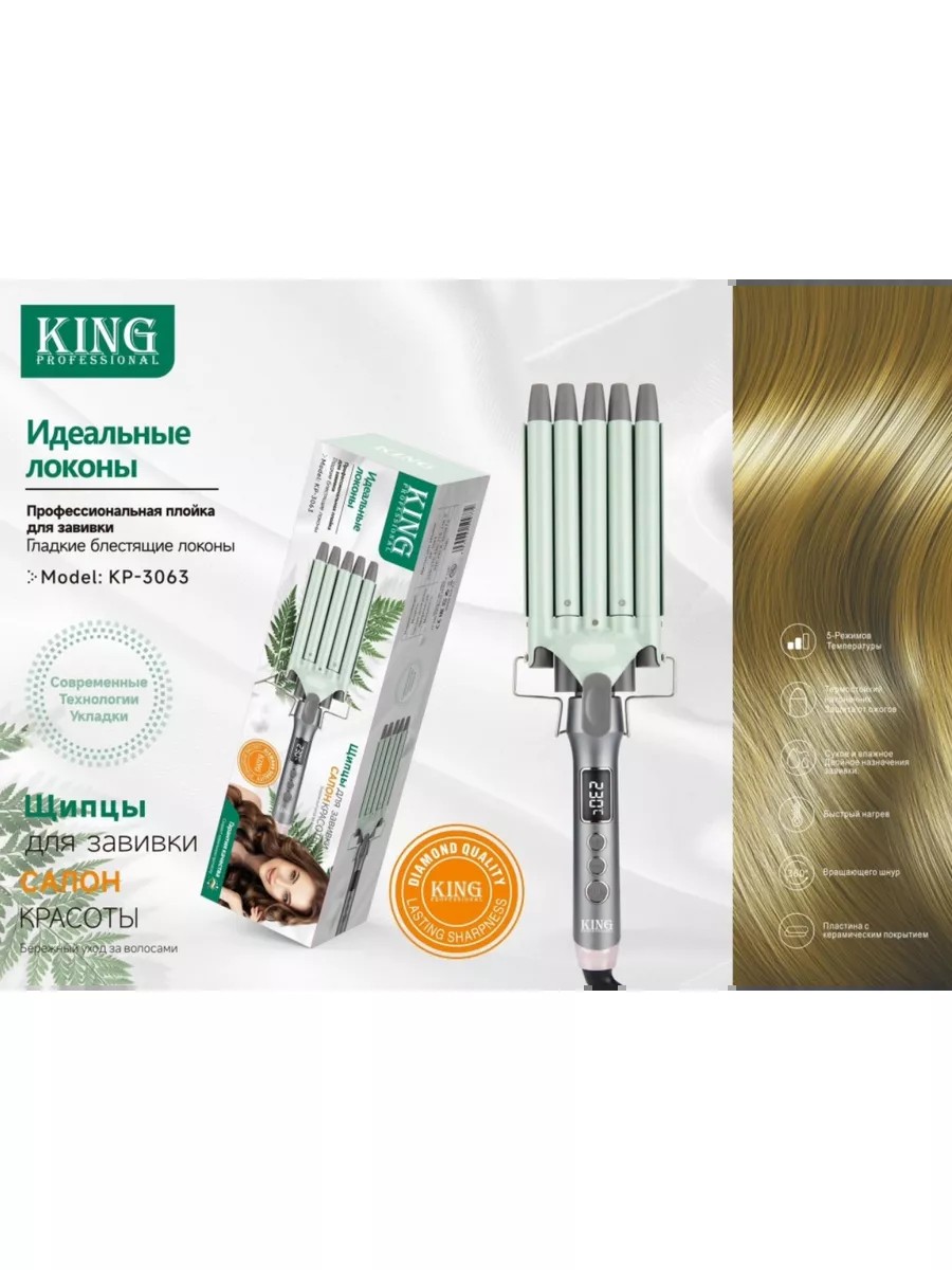 Плойка KING KP-3063-пяти секционная профессиональная плойка для волос, предназначается для создания роскошной волнообразной укладки. Волны, благодаря специальному механизму, получаются ровными, затрата времени на их создание минимальна. Предусмотренный терморегулятор поможет подобрать оптимальную для волос температуру. 3 варианта укладки: волны, легкие кудри, плотные кудри. Турмалиновые пластины с керамическим напылением обеспечат гладкое скольжение и защитят волосы от пересушивание и ломкости.- Плойка KING KP-3063 создана специально для создания уникальных 3D-волн и кудряшек.- Покрытие турмалин обеспечивает долгий срок службы и постоянное распределение тепла, способствует проявлению блеска и улучшает их расчесывание и укладку.- С помощью регулятора, можно подобрать идеальную температуру для укладки (от 150 до 230 градусов)- Диаметр 16 mm (крупная)- Термостойкий наконечник- Встроенная безопасная металлическая подставка-опора.