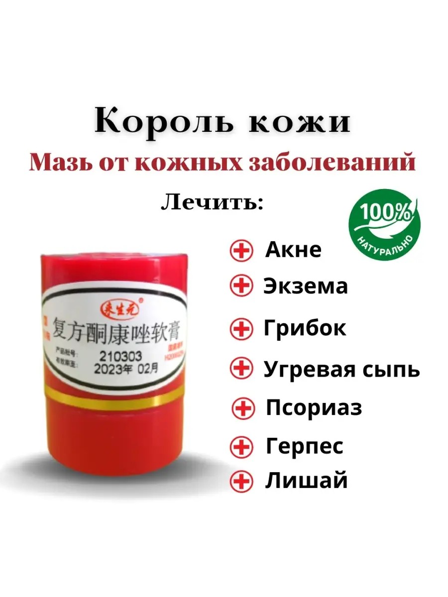 King of Skin Ointment for Acne on the Face. Chinese King of Skin Ointment is a highly effective and powerful remedy that combats most skin diseases and prevents their recurrence. The cream has broad-spectrum antifungal properties and is a reliable remedy for treating skin ailments of various origins. This acne ointment is recommended for widespread use by the World Association of Dermatologists. It does not cause adverse reactions. Chinese acne ointment indications: Psoriasis, skin and nail mycoses, eczema, seborrheic dermatitis, fungal sepsis, cutaneous leishmaniasis, herpes, acne, warts, and papillomas. A very effective ointment for psoriasis, herpes, acne, itching, and rashes. Ketoconazole cream. Psoriasis ointment, King of Skin. Cream, King of Skin. Ointment for itching. Cream for oily skin, King of Skin ointment, Chinese ointment for acne, psoriasis ointment, King of Skin cream for scars on the face.