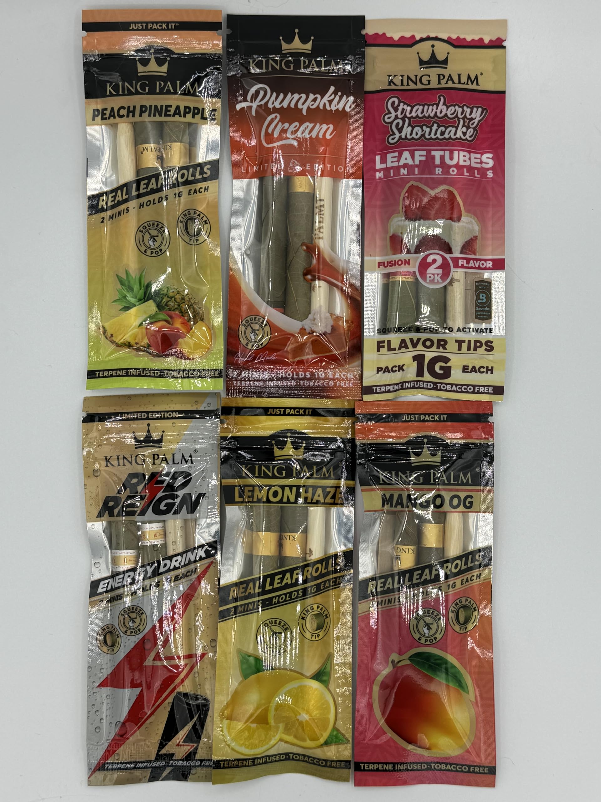 King Palm Flavoured Mini Rolls with We Roll With It Tube 2 Mini Rolls Per Pack includes Boveda Humidity Control Pack 12 Total Rolls Per Bundle Peach Pineapple, Pumpkin Cream, Strawberry Shortcake, Red Reign, Lemon Haze, Mango OGPeach Pineapple, Pumpkin Cream, Strawberry Shortcake, Red Reign, Lemon Haze, Mango OG.