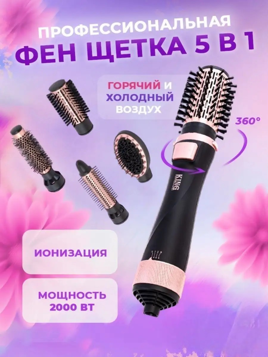 Фен-щетка для волос KING professional - это профессиональная фен-щетка которая может использоваться одновременно как фен и выпрямитель для волос, стайлер, браш или плойка для волос. Мультистайлер способен работать в трех температурных режимах - холодный, средний и горячий. Во время завивки фен обеспечивает ионизацию волос, которая обеспечивает безопасный и здоровый уход за волосами любой длины и густоты. Устройство оснащено вращающимся шнуром, петлей для подвешивания на крючок для более удобного хранения. Производитель предоставляет гарантию 1 год на стайлер для волос KING professional. Браш для волос станет превосходной заменой традиционной плойке для завивки. Фен-щетка для волос бережно сушит и разглаживает кудрявые или слегка вьющиеся волосы. Температура воздушного потока исключает повреждение волосяных луковиц или чрезмерное иссушение кожи головы. Расческа для укладки волос позволит создать взрослую или детскую прическу любой сложности. Расческа для волос легко очищается и не нуждается в специальном уходе. Фен щетка для волос 5 в 1 включает в себя 5 сменных насадок которые подойдут для любой длины волос или типа укладки - брашинги для укладки: большой, средний, тонкий, круглая насадка для завивки волос и насадка расческа для волос. Длина шнура 2 метра, прекрасно подойдёт для использования дома и в путешествии. Мы рекомендуем фен стайлер для волос в качестве подарка маме или подруге на день рождения, 14 февраля или 8 марта.